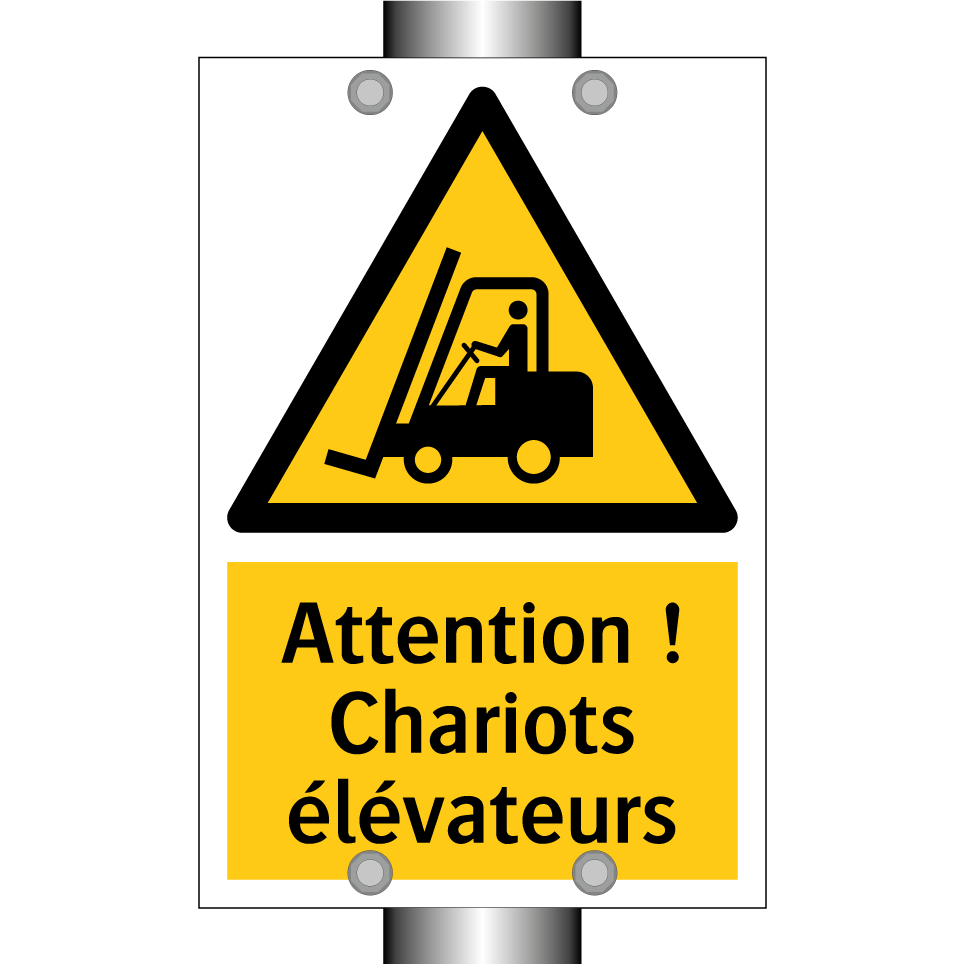 Panneau d'avertissement avec le texte : "Attention ! Chariots élévateurs"