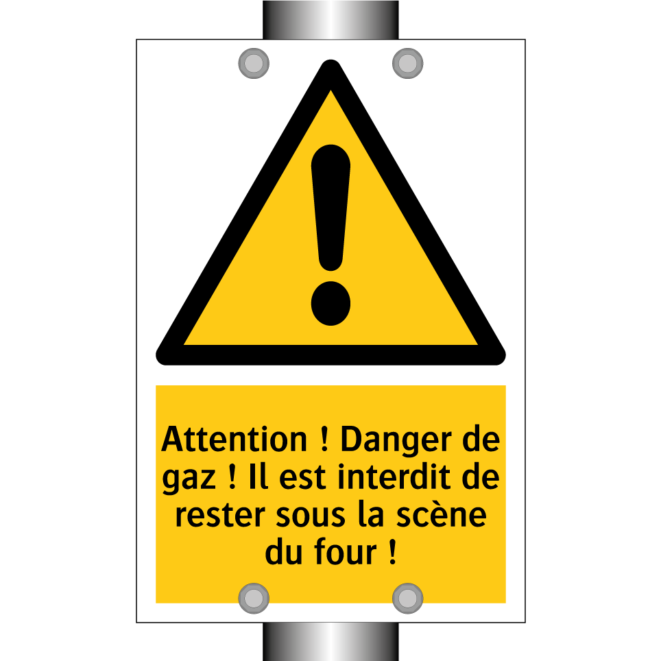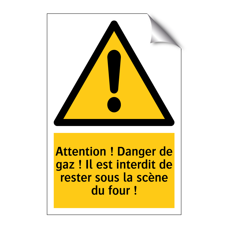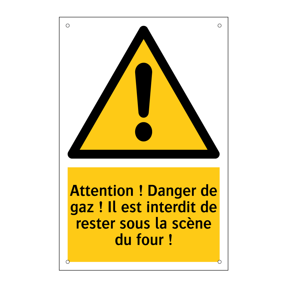 Panneau d'avertissement avec le texte : "Attention ! Danger de gaz ! Il est interdit de rester sous la scène du four !"