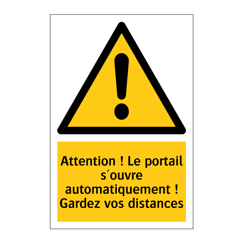 Panneau d'avertissement avec le texte : "Attention ! Le portail s'ouvre automatiquement ! Gardez vos distances"