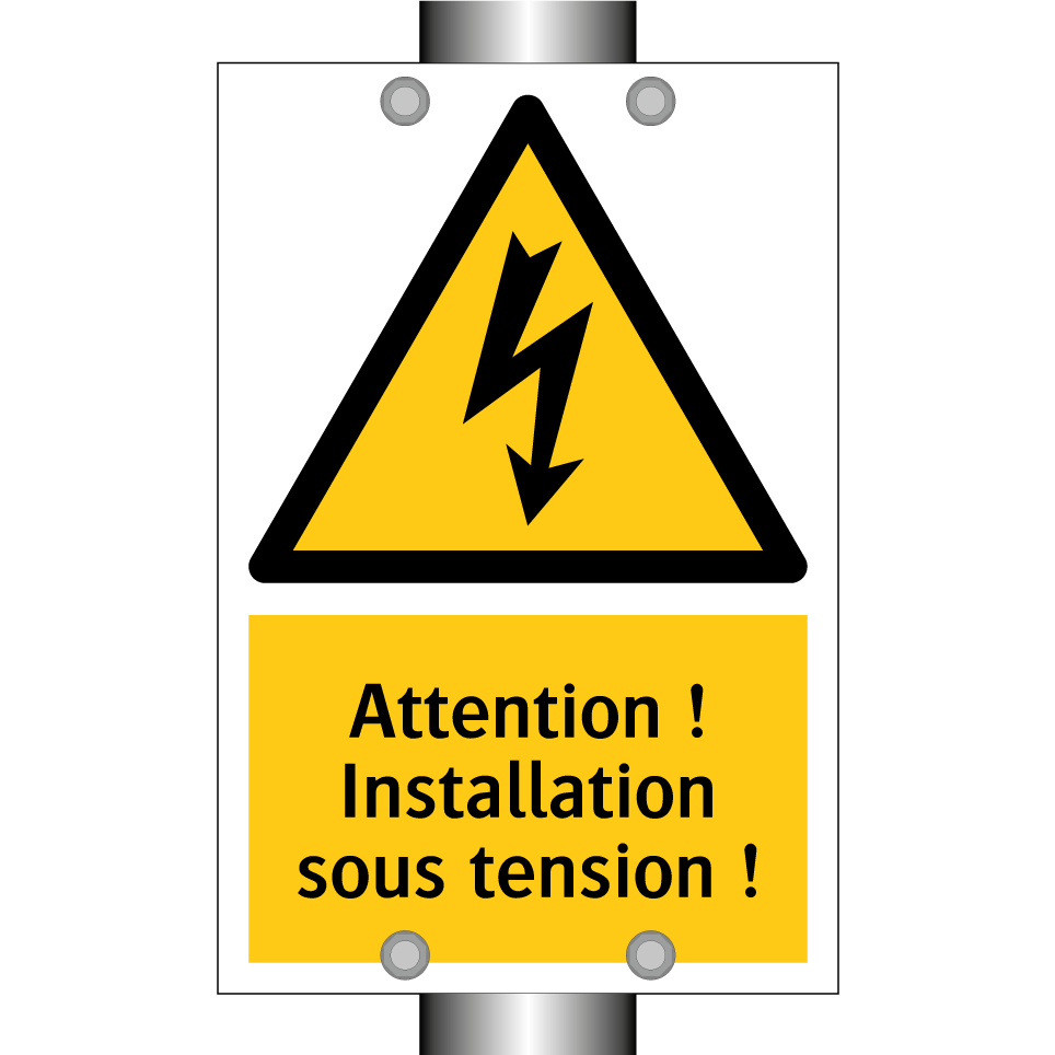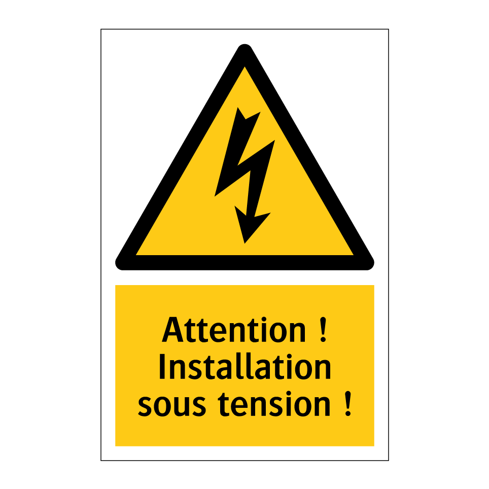 Panneau d'avertissement avec le texte : "Attention ! Installation sous tension !"
