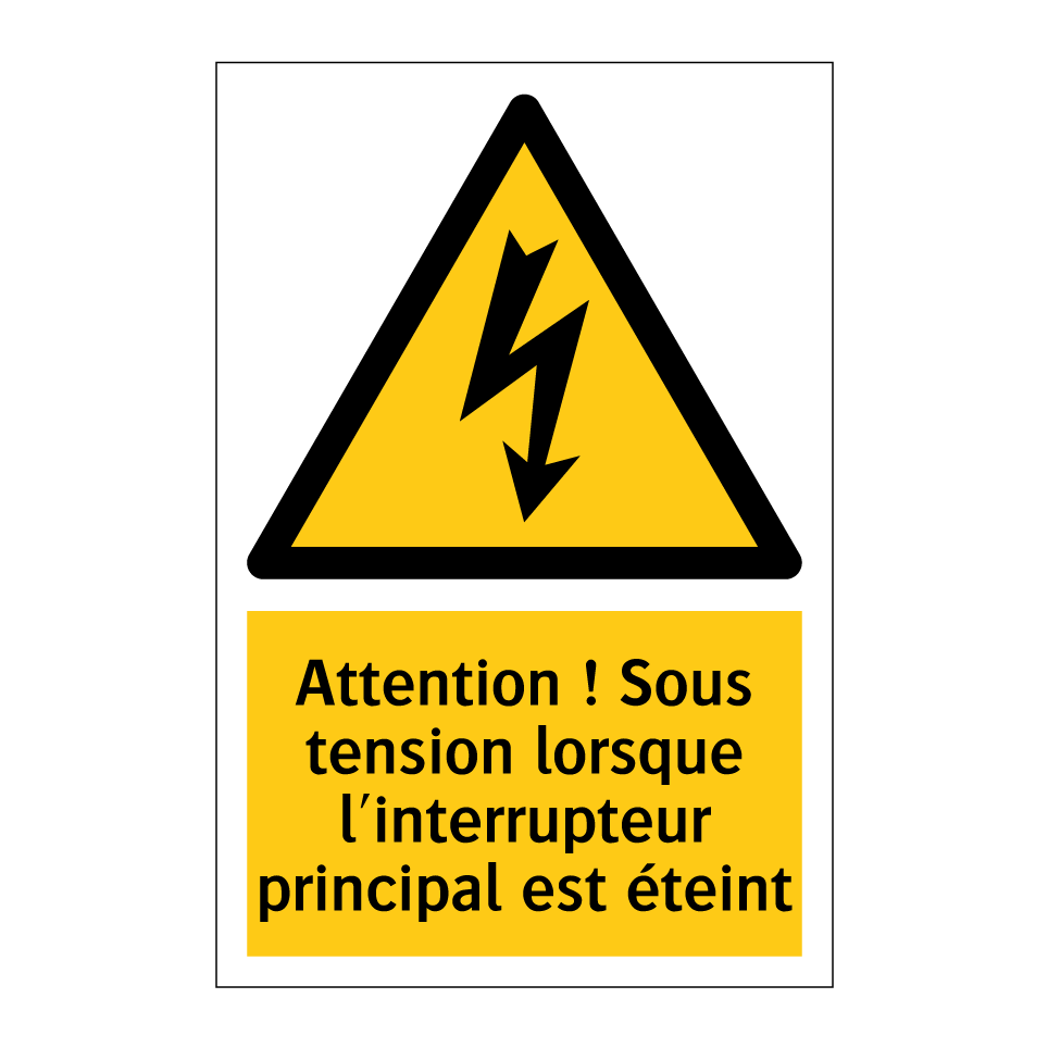 Panneau d'avertissement avec le texte : "Attention ! Sous tension lorsque l'interrupteur principal est éteint"