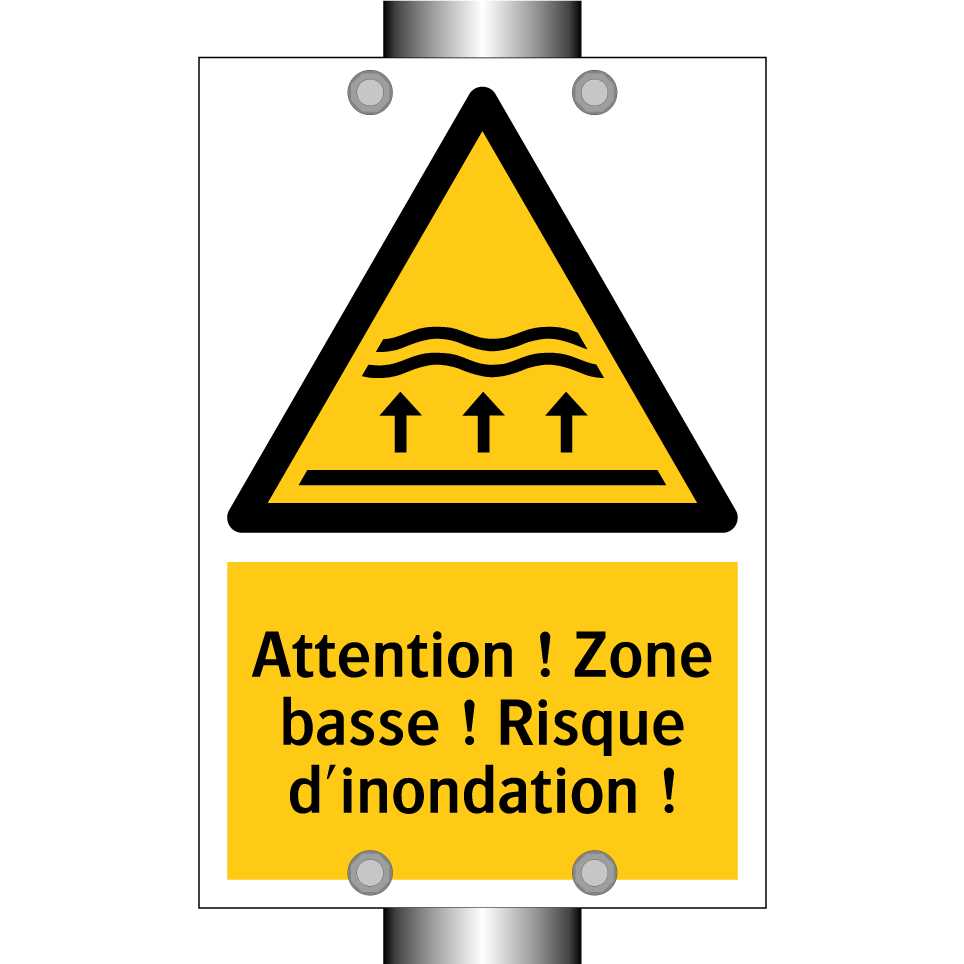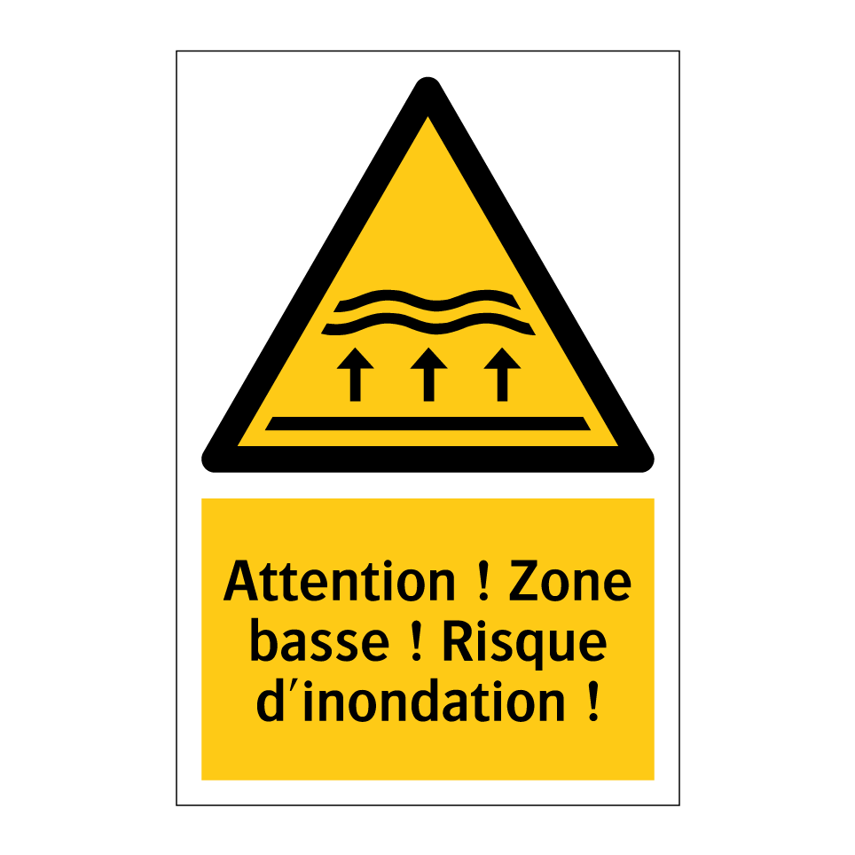 Panneau d'avertissement avec le texte : "Attention ! Zone basse ! Risque d'inondation !"