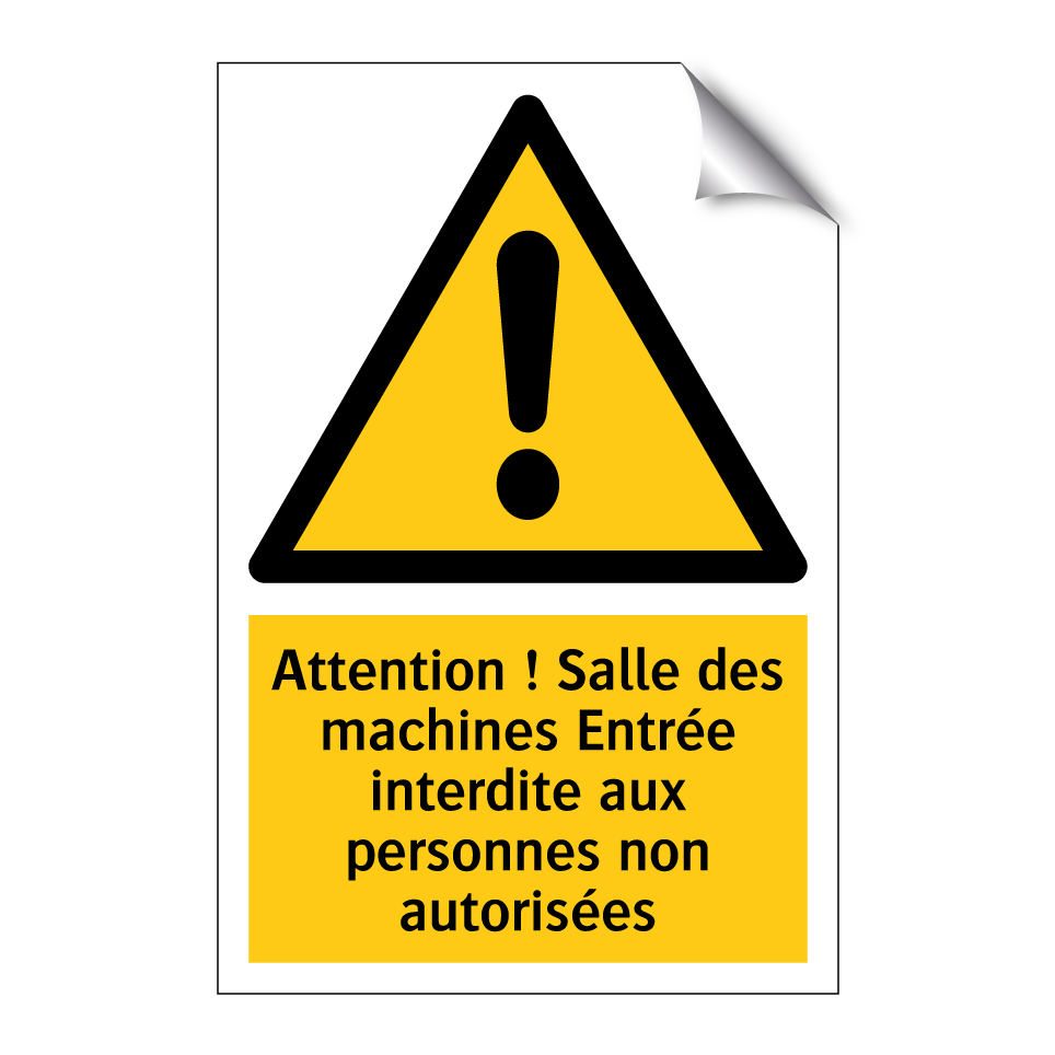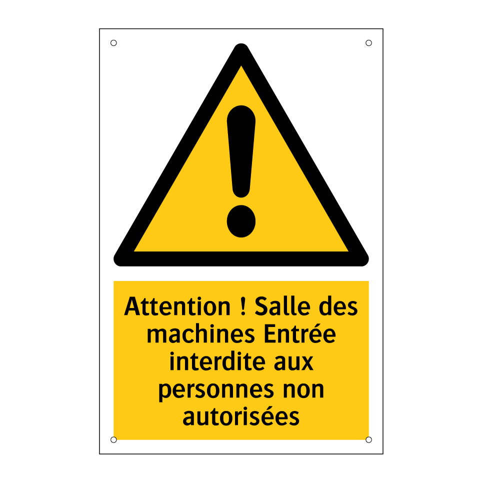Panneau d'avertissement avec le texte : "Attention ! Salle des machines Entrée interdite aux personnes non autorisées"