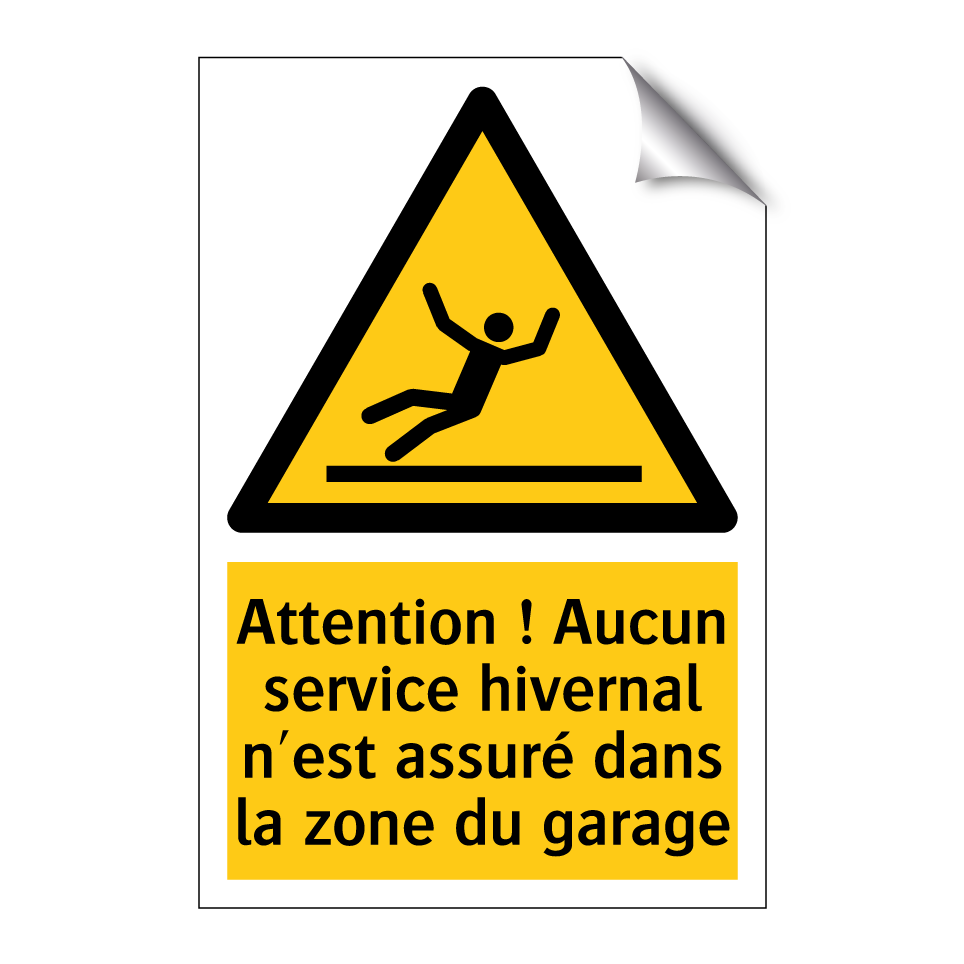 Panneau d'avertissement avec le texte : "Attention ! Aucun service hivernal n'est assuré dans la zone du garage"