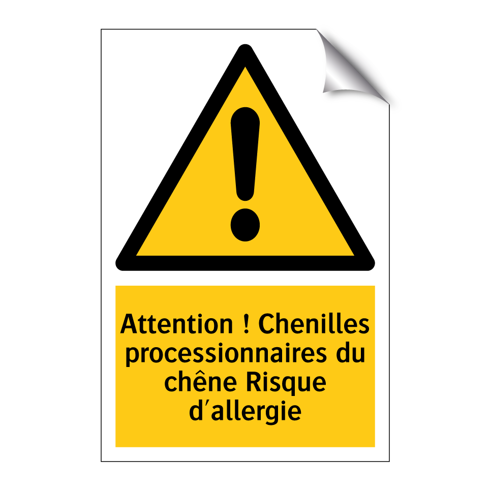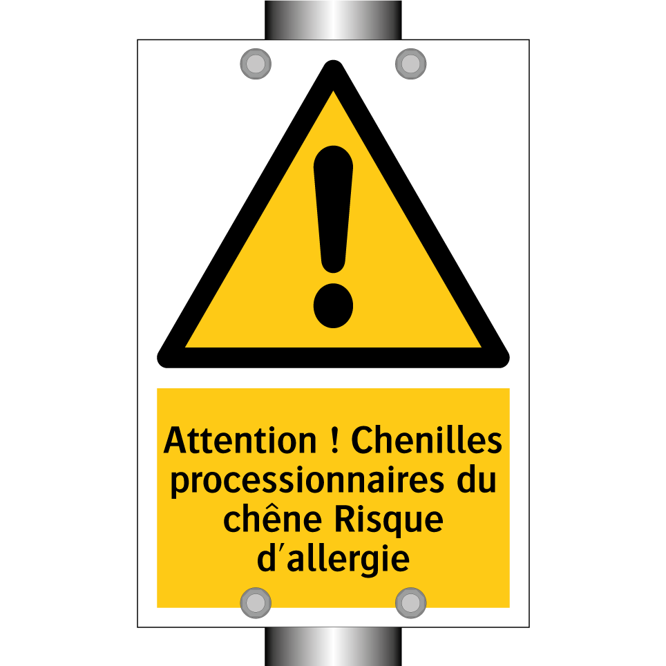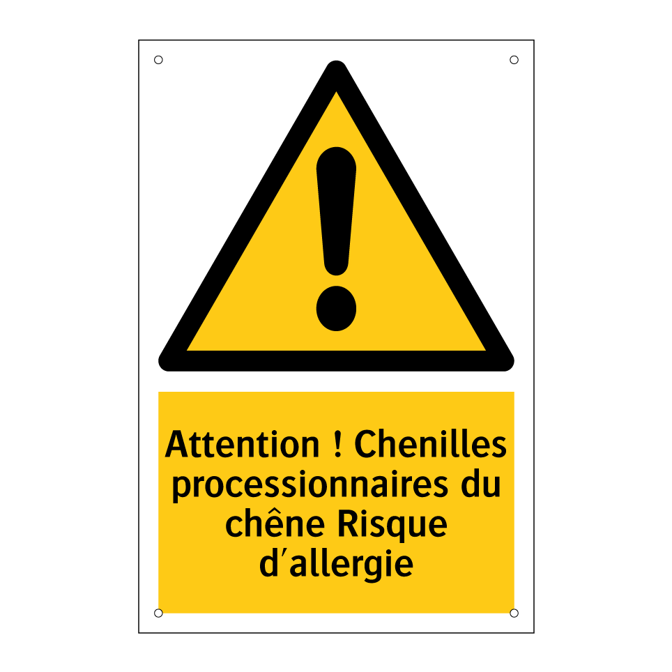 Panneau d'avertissement avec le texte : "Attention ! Chenilles processionnaires du chêne Risque d'allergie"