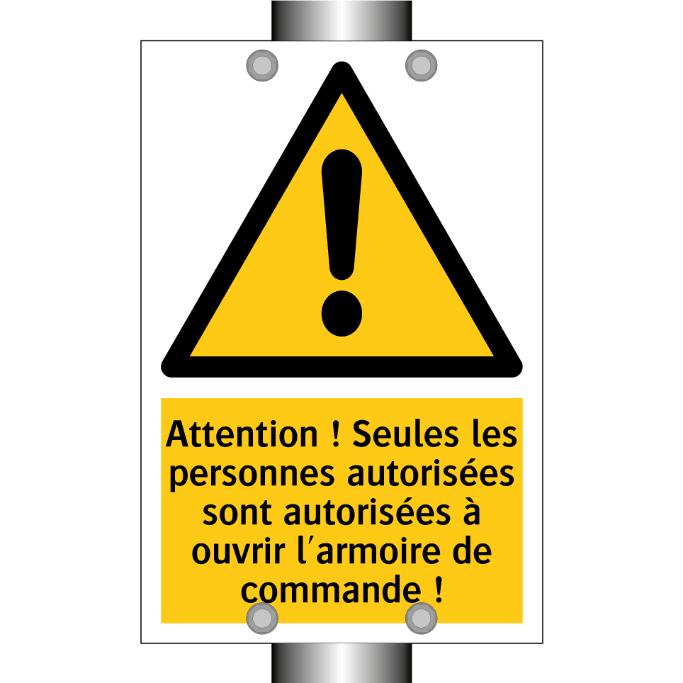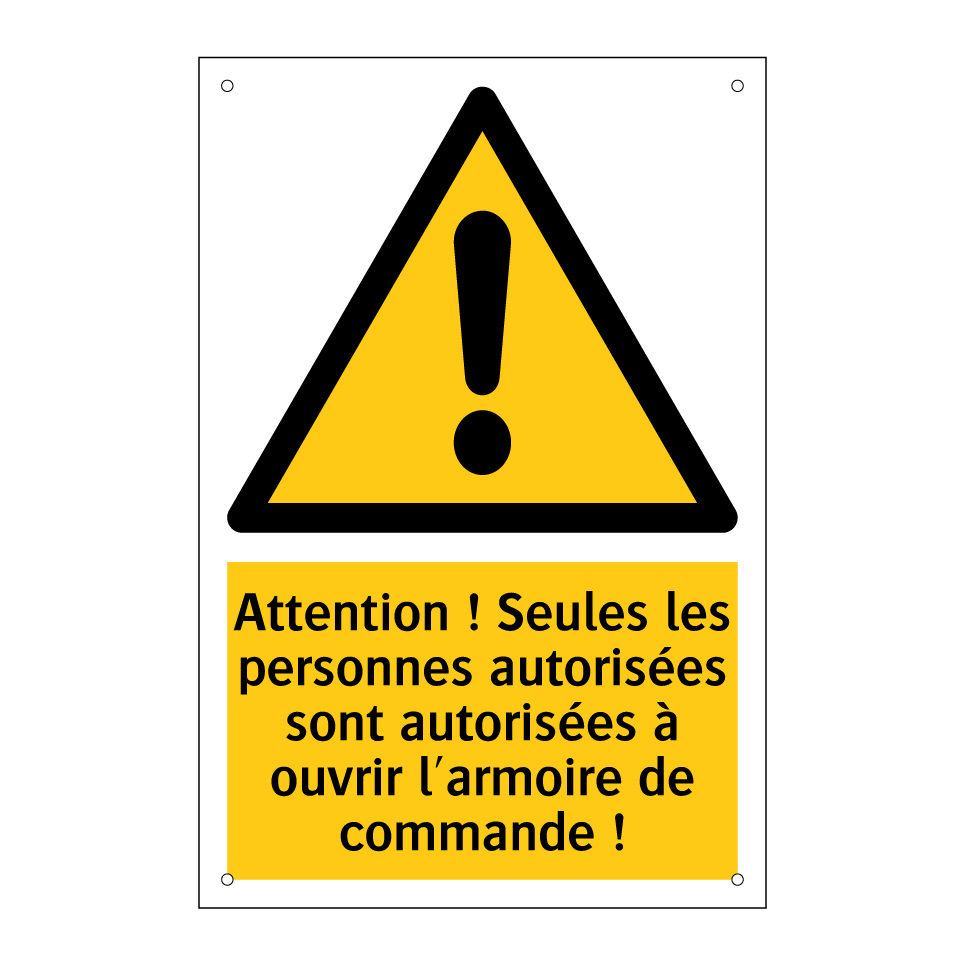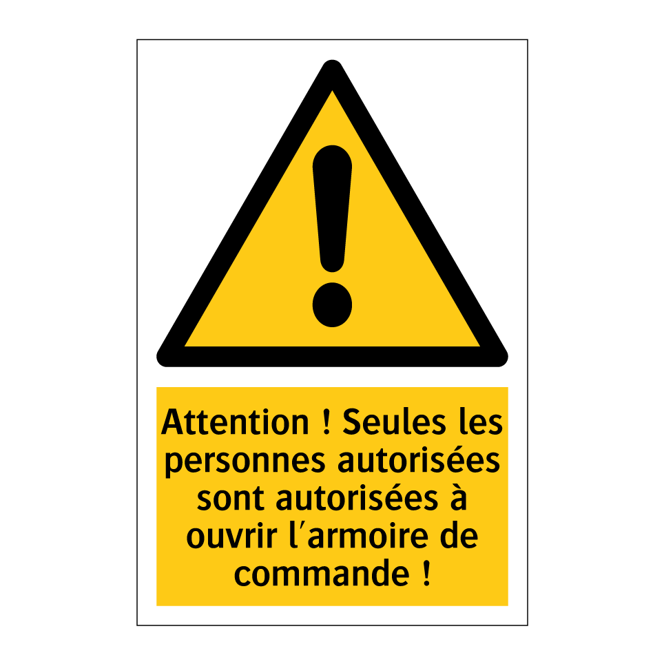 Panneau d'avertissement avec le texte : "Attention ! Seules les personnes autorisées sont autorisées à ouvrir l'armoire de commande !"
