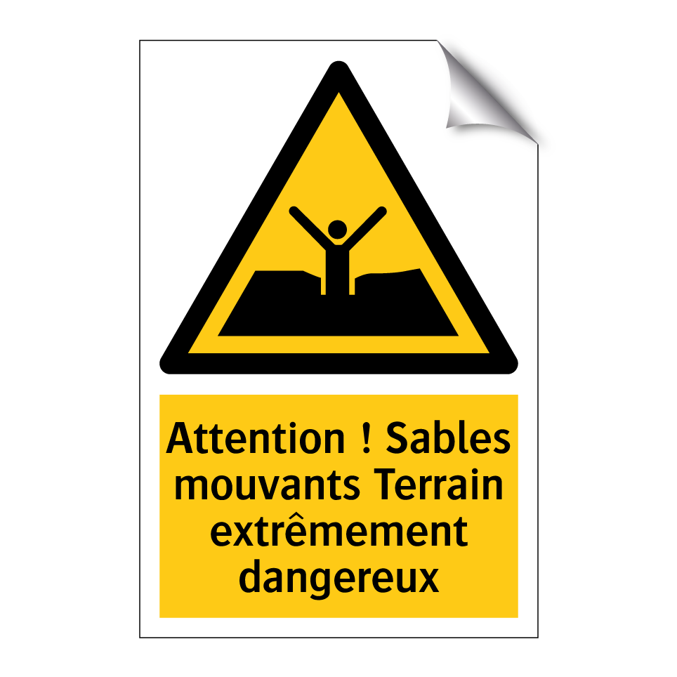 Panneau d'avertissement avec le texte : "Attention ! Sables mouvants Terrain extrêmement dangereux"