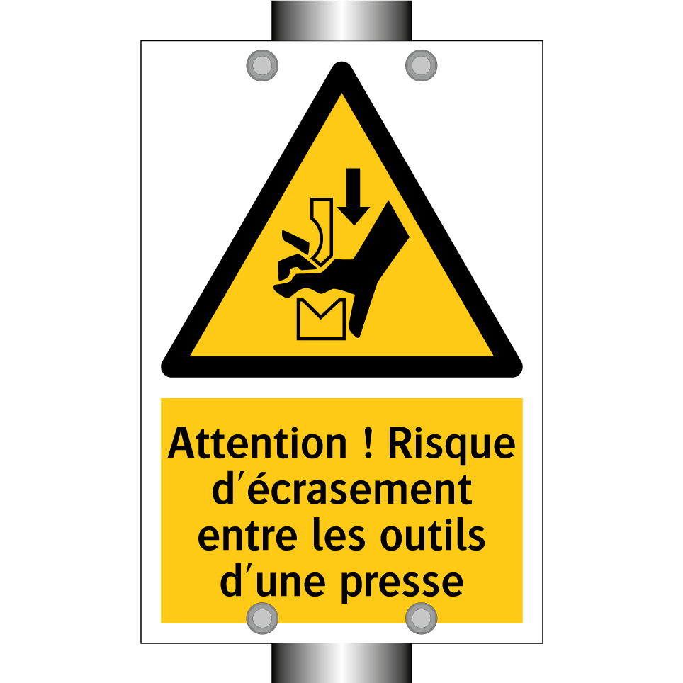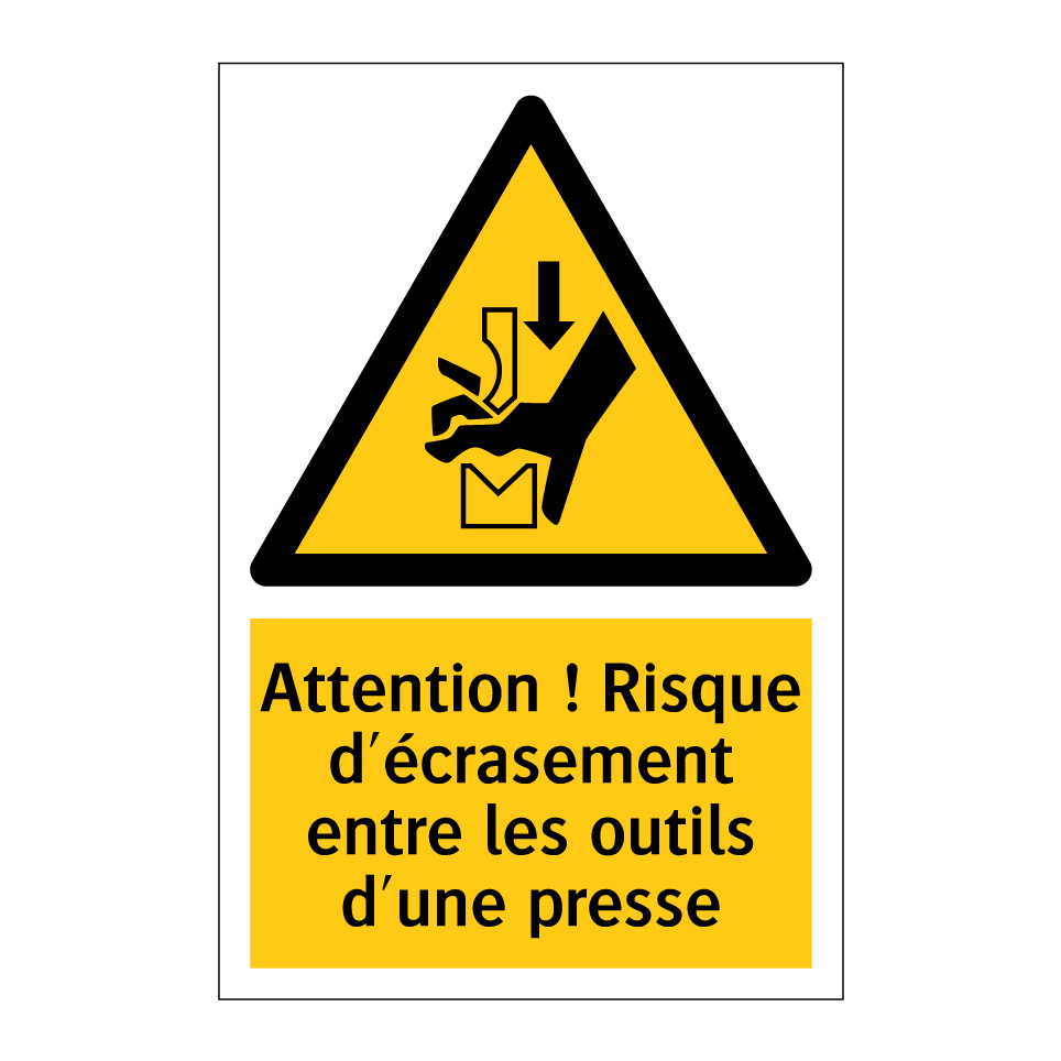 Panneau d'avertissement avec le texte : "Attention ! Risque d'écrasement entre les outils d'une presse"