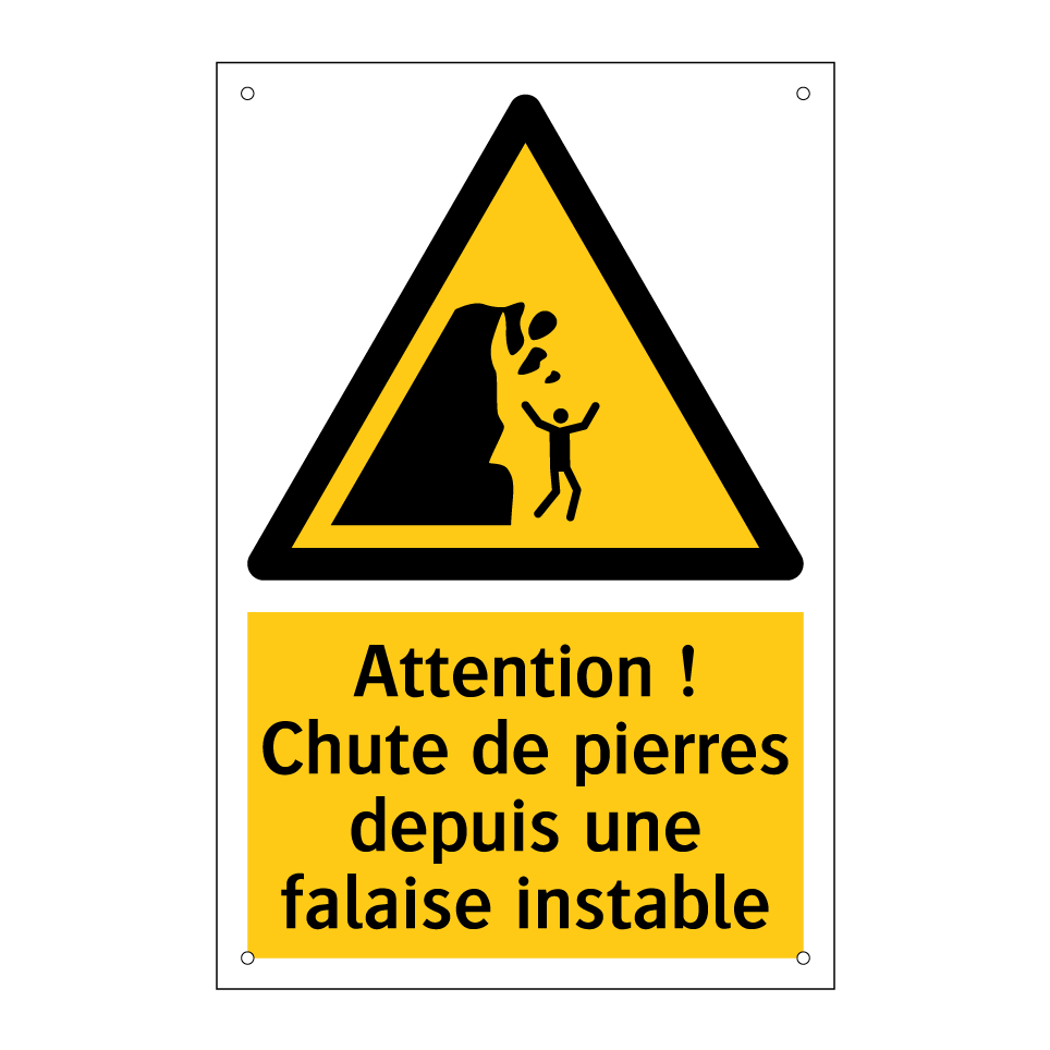 Ce panneau d'avertissement est essentiel pour garantir la sécurité dans les zones sujettes aux chutes de pierres. Idéal pour être placé à proximité de falaises instables, il alerte efficacement les passants du danger potentiel. Grâce à sa couleur jaune vive et son texte noir, il capte immédiatement l'attention, assurant que le message de prudence est bien reçu. Ce type de signalisation est particulièrement adapté pour les sentiers de randonnée, les routes de montagne ou toute autre zone où des éboulements peuvent survenir. En installant ce panneau, vous contribuez à prévenir les accidents et à protéger les visiteurs des risques naturels.