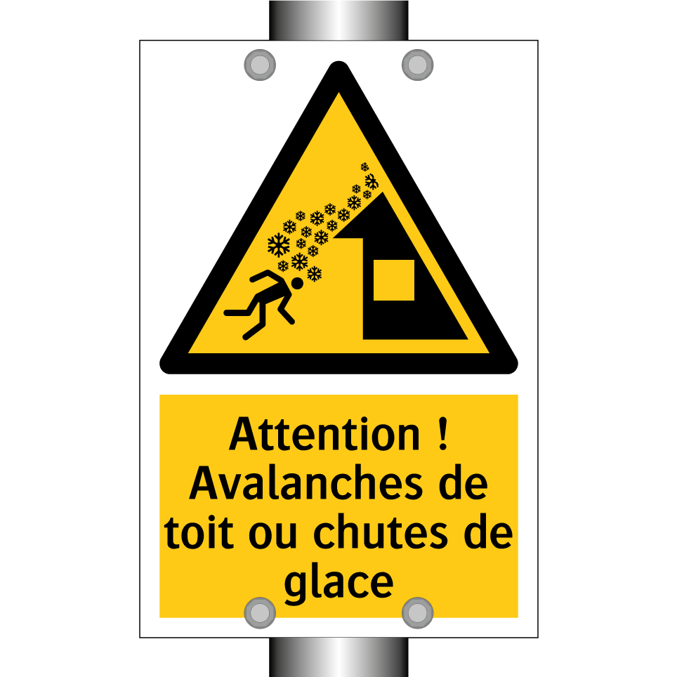 Panneau d'avertissement avec le texte : "Attention ! Avalanches de toit ou chutes de glace"