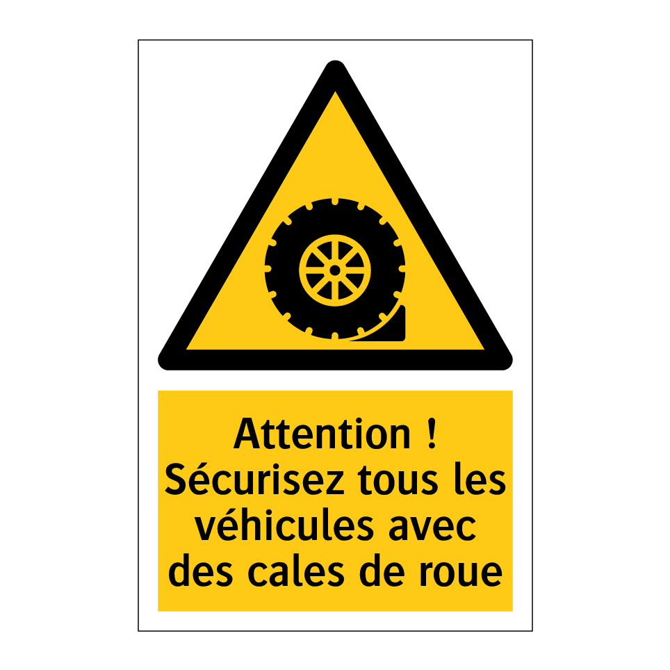 Panneau d'avertissement avec le texte : "Attention ! Sécurisez tous les véhicules avec des cales de roue"