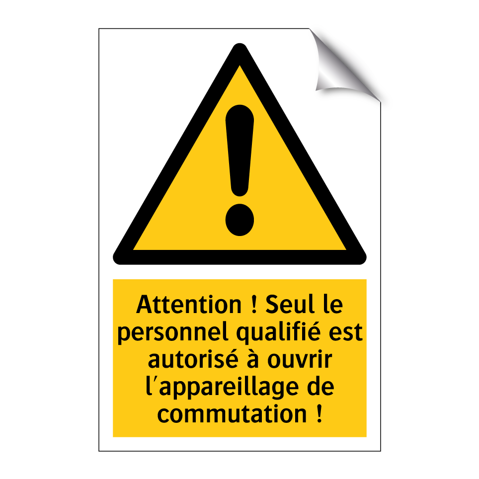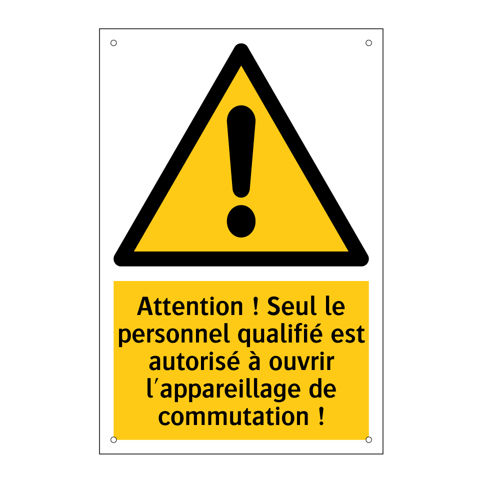 Panneau d'avertissement avec le texte : "Attention ! Seul le personnel qualifié est autorisé à ouvrir l'appareillage de commutation !"