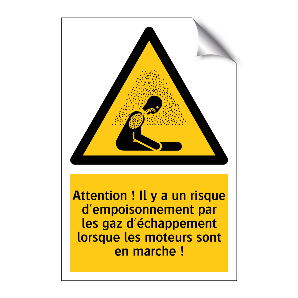 Panneau d'avertissement avec le texte : "Attention ! Il y a un risque d'empoisonnement par les gaz d'échappement lorsque les moteurs sont en marche !"