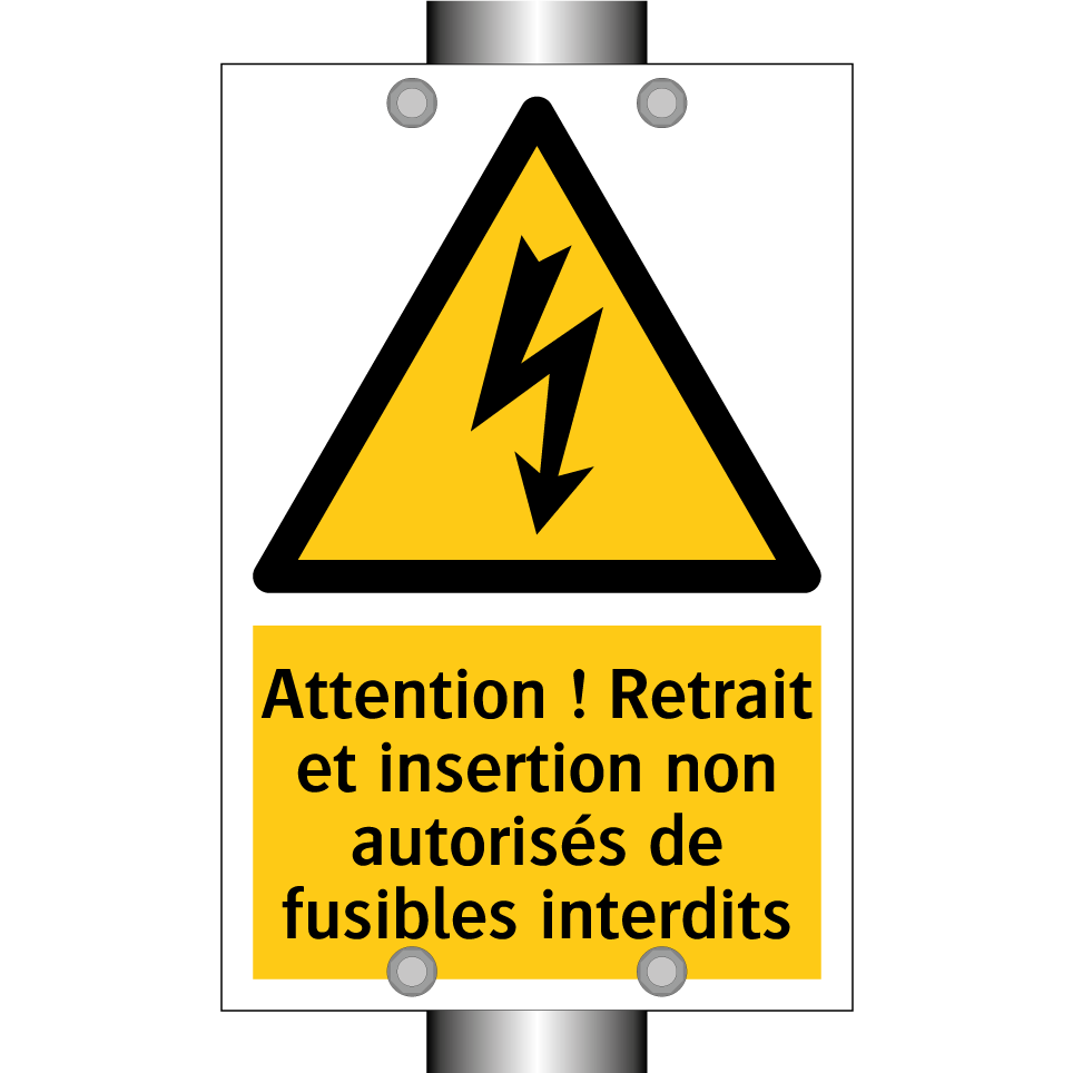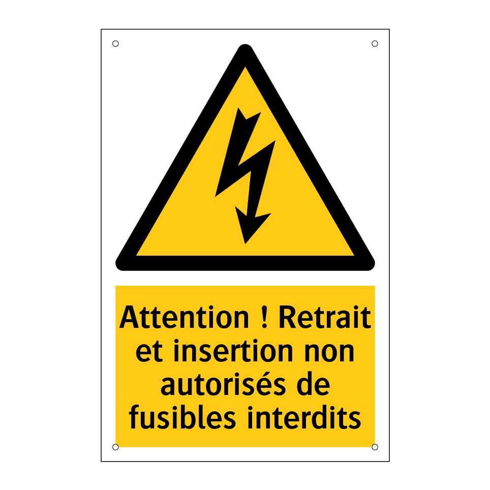 Panneau d'avertissement avec le texte : "Attention ! Retrait et insertion non autorisés de fusibles interdits"