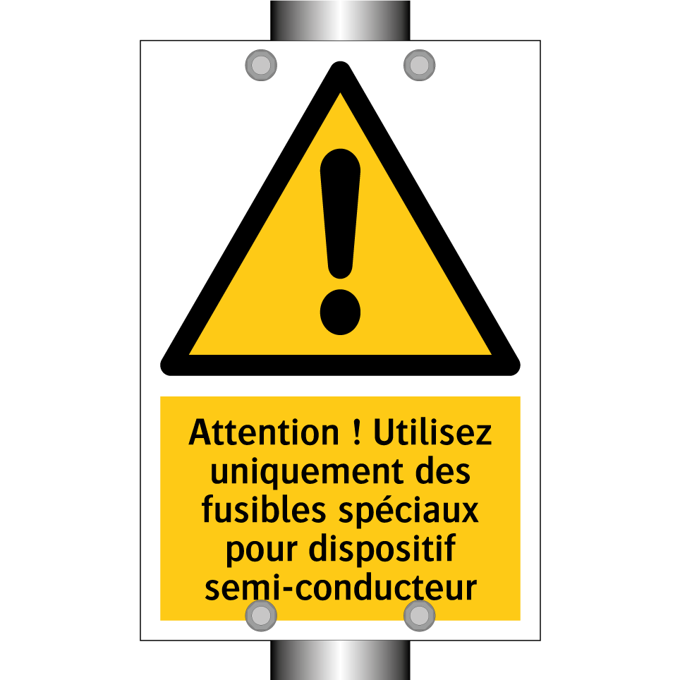 Panneau d'avertissement avec le texte : "Attention ! Utilisez uniquement des fusibles spéciaux pour dispositif semi-conducteur"
