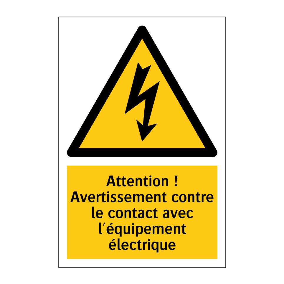 Panneau d'avertissement avec le texte : "Attention ! Avertissement contre le contact avec l'équipement électrique"
