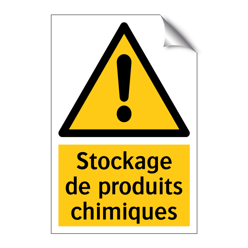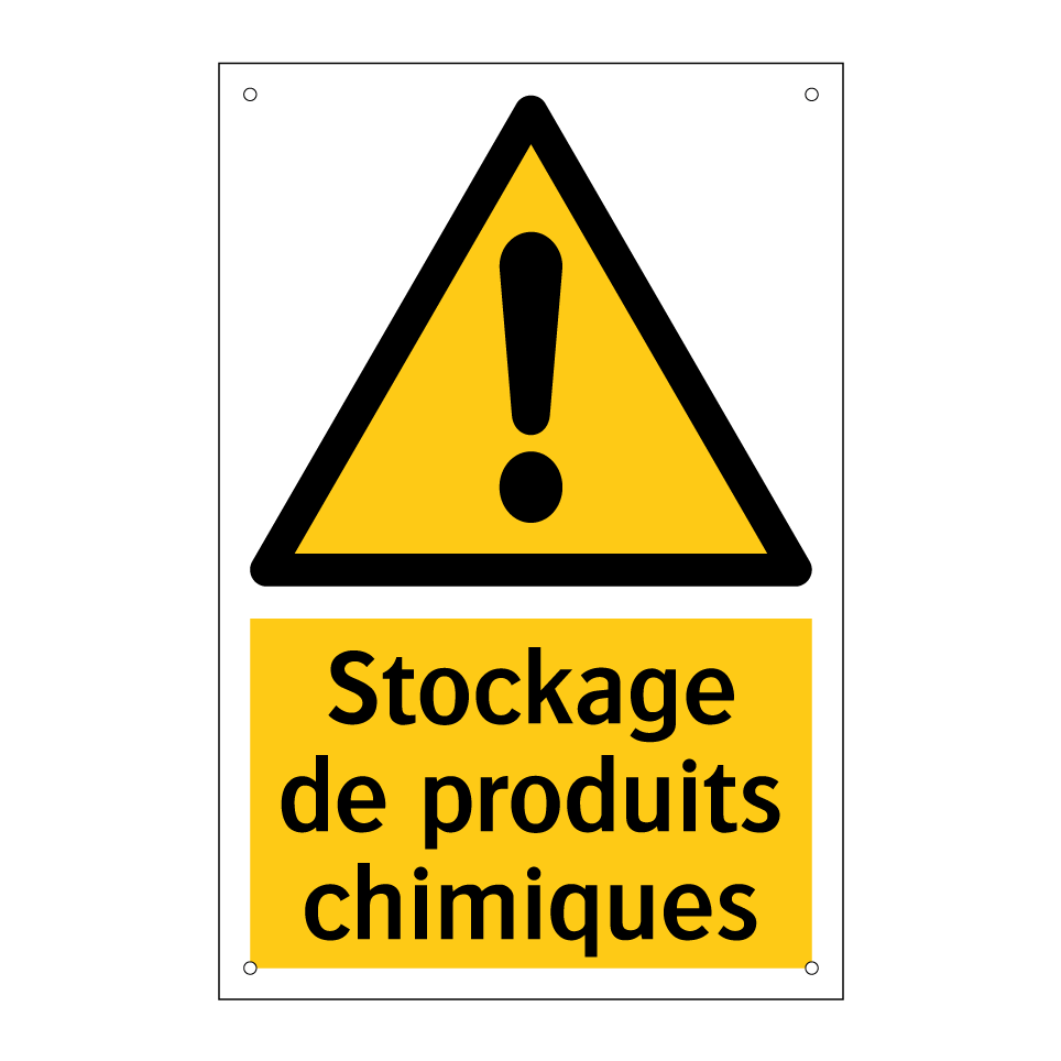 Panneau d'avertissement avec le texte : "Stockage de produits chimiques"