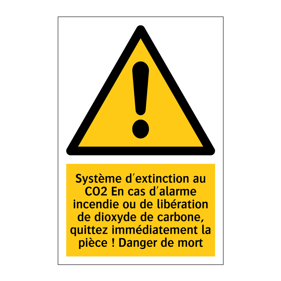 Panneau d'avertissement avec le texte : "Système d'extinction au CO2 En cas d'alarme incendie ou de libération de dioxyde de carbone, quittez immédiatement la pièce ! Danger de mort"