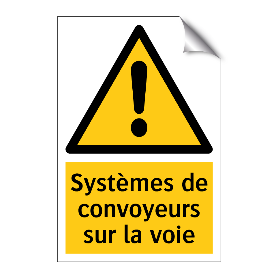Panneau d'avertissement avec le texte : "Systèmes de convoyeurs sur la voie"