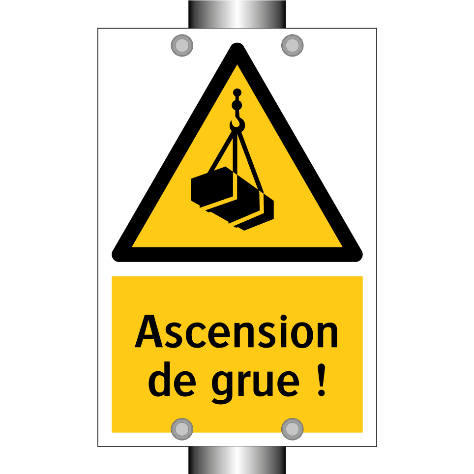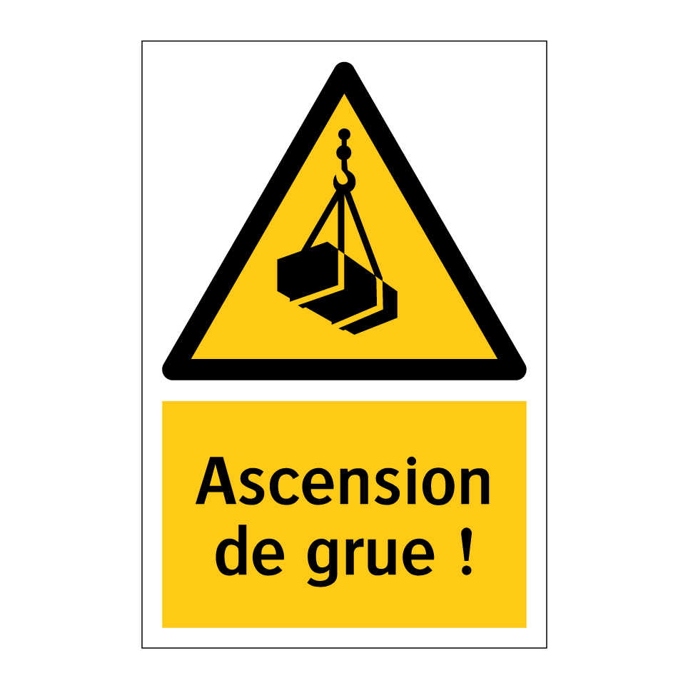 Panneau d'avertissement avec le texte : "Ascension de grue !"