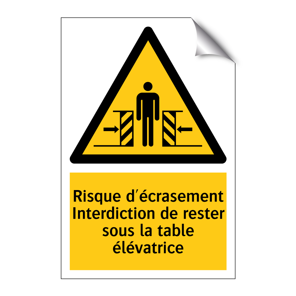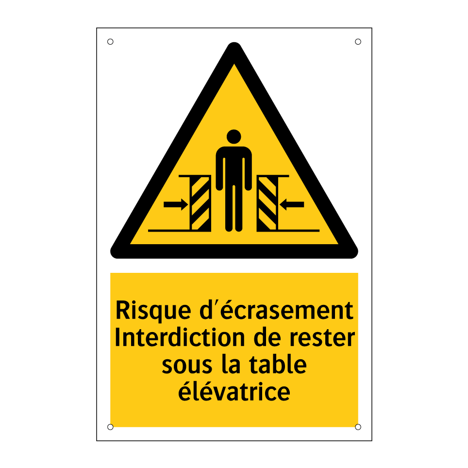Panneau d'avertissement avec le texte : "Risque d'écrasement Interdiction de rester sous la table élévatrice"