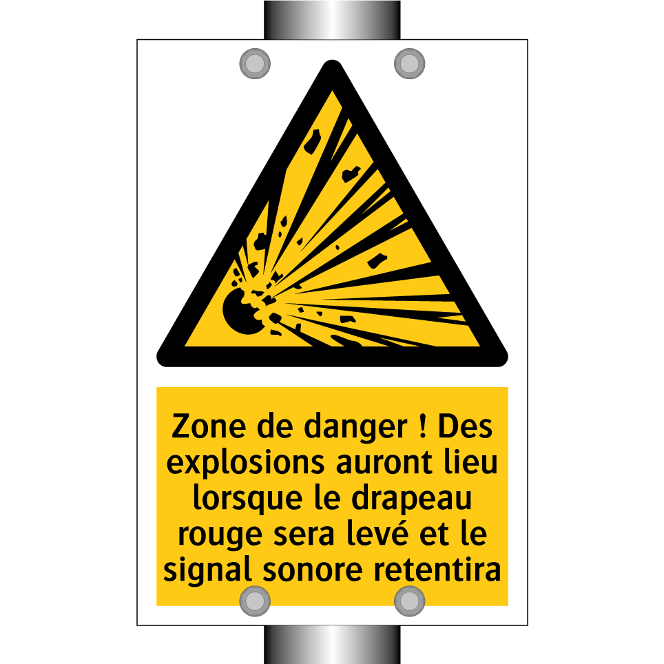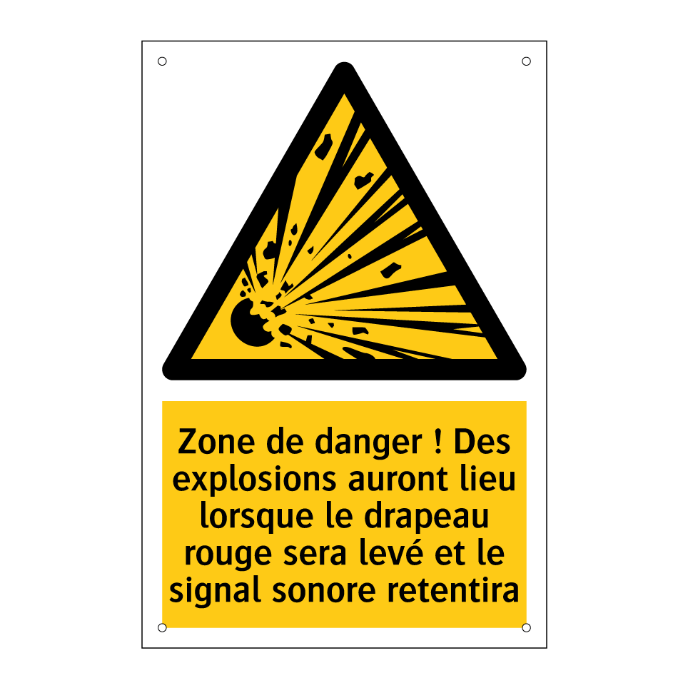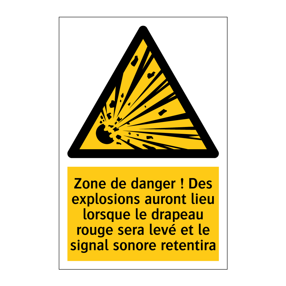 Panneau d'avertissement avec le texte : "Zone de danger ! Des explosions auront lieu lorsque le drapeau rouge sera levé et le signal sonore retentira"