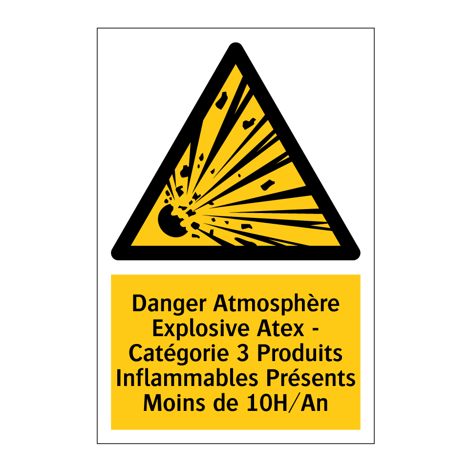 Panneau d'avertissement avec le texte : "Danger Atmosphère Explosive Atex - Catégorie 3 Produits Inflammables Présents Moins de 10H/An"