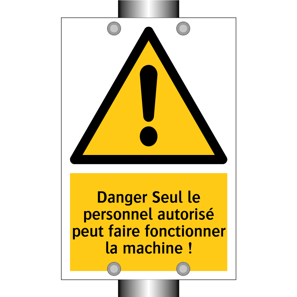 Panneau d'avertissement avec le texte : "Danger Seul le personnel autorisé peut faire fonctionner la machine !"