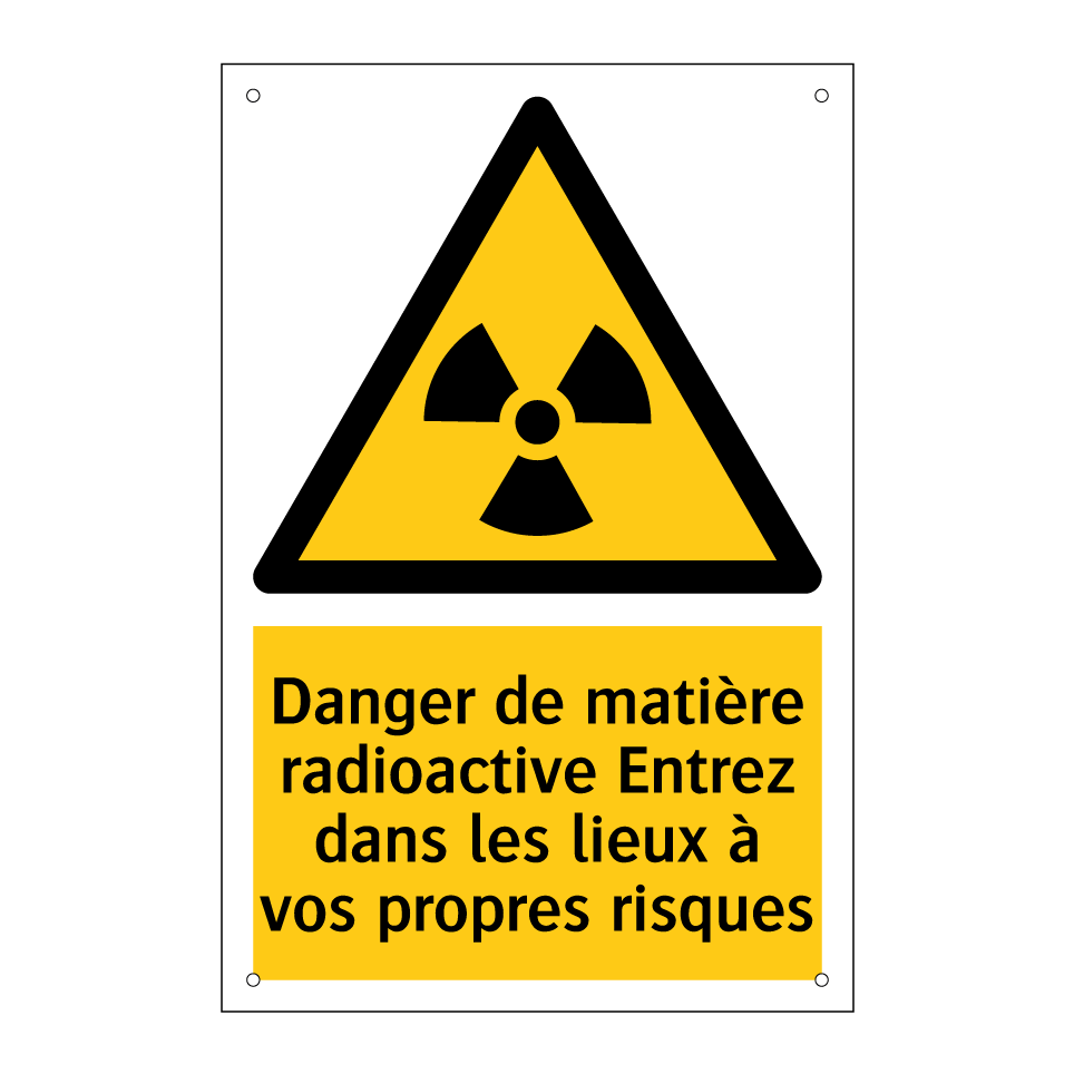 Panneau d'avertissement avec le texte : "Danger de matière radioactive Entrez dans les lieux à vos propres risques"