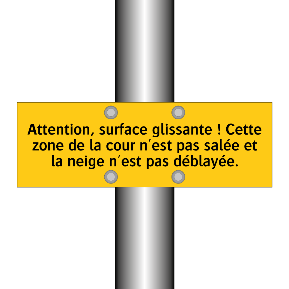 Panneau d'avertissement avec le texte : "Attention, surface glissante ! Cette zone de la cour n'est pas salée et la neige n'est pas déblayée"