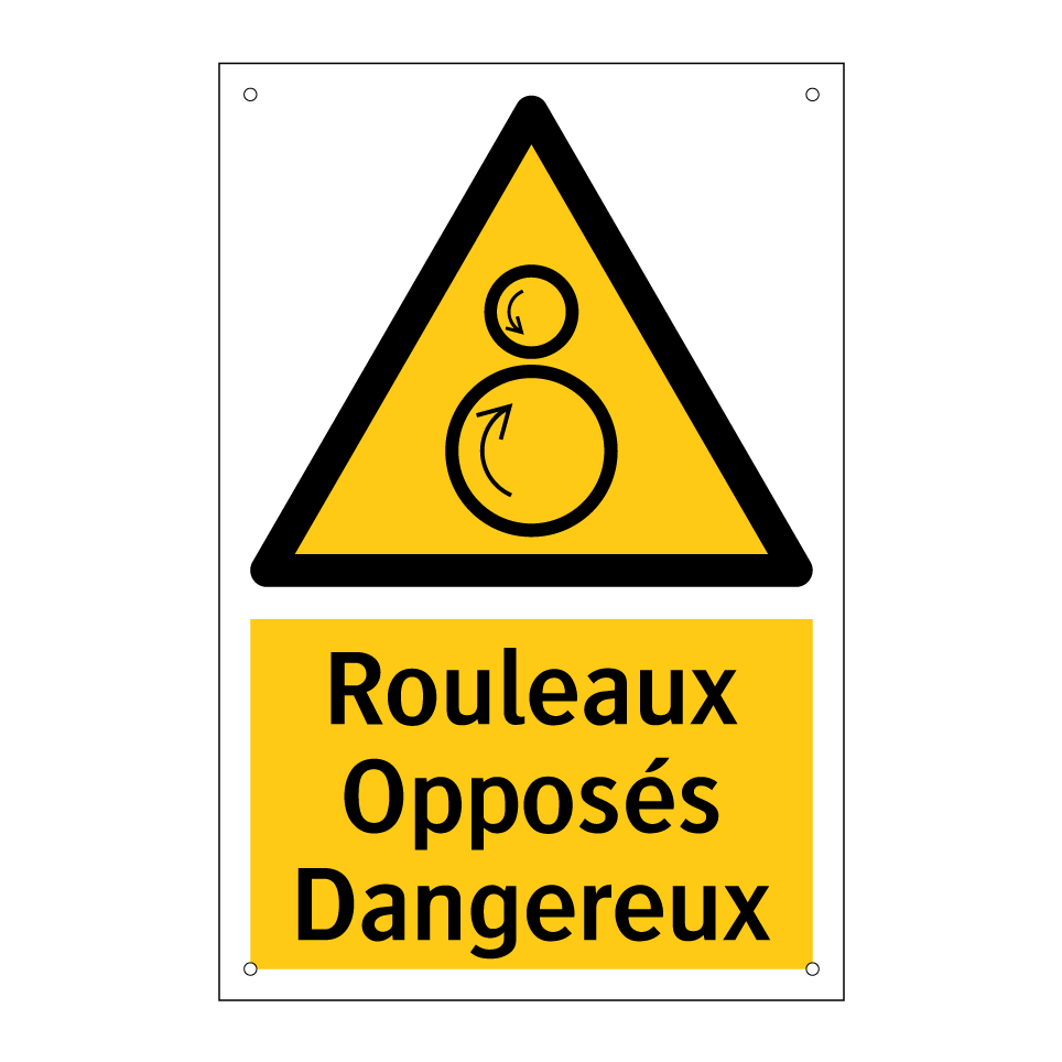 Panneau d'avertissement avec le texte : "Rouleaux Opposés Dangereux"