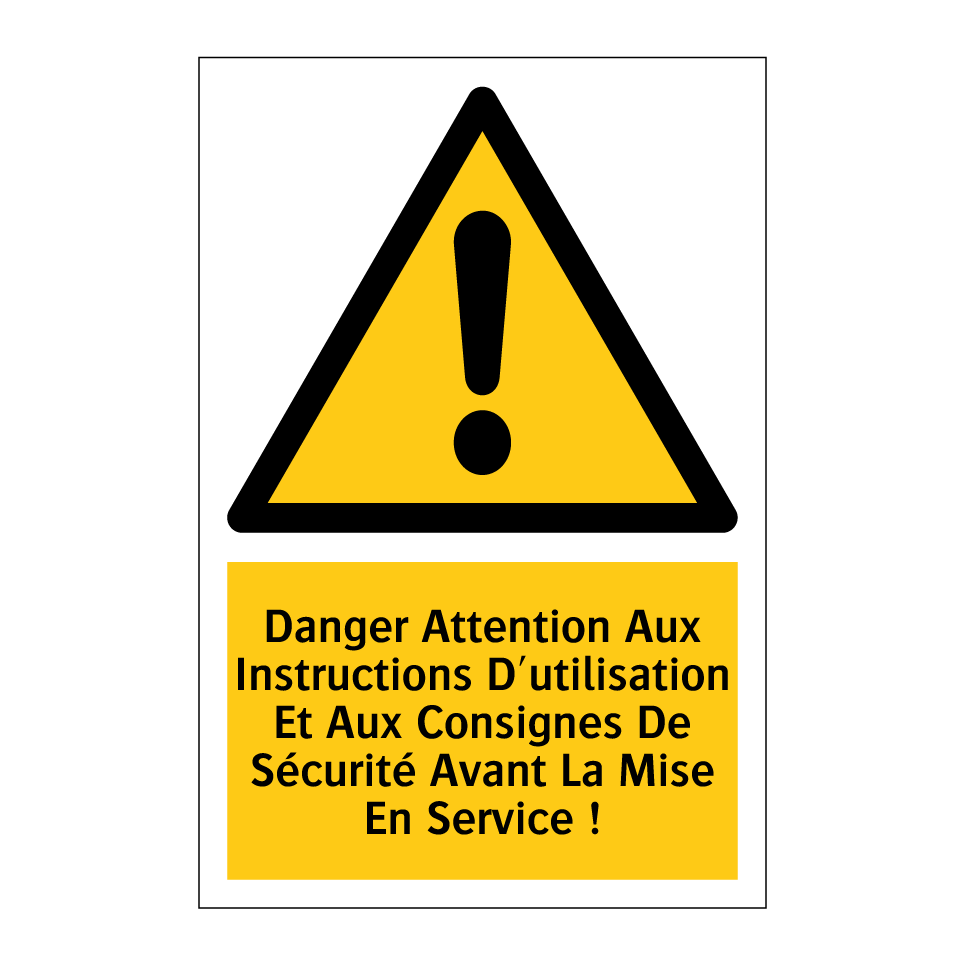 Panneau d'avertissement avec le texte : "Danger Attention Aux Instructions D'utilisation Et Aux Consignes De Sécurité Avant La Mise En Service !"
