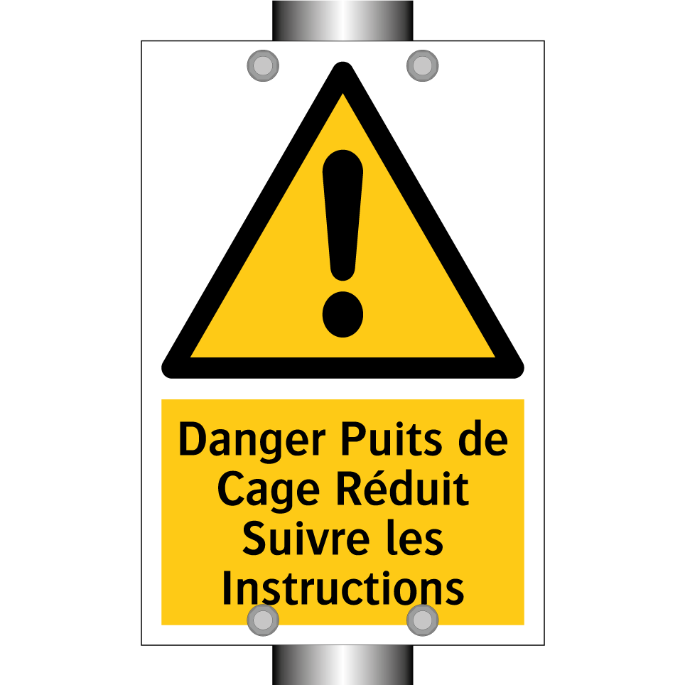 Panneau d'avertissement avec le texte : "Danger Puits de Cage Réduit Suivre les Instructions"