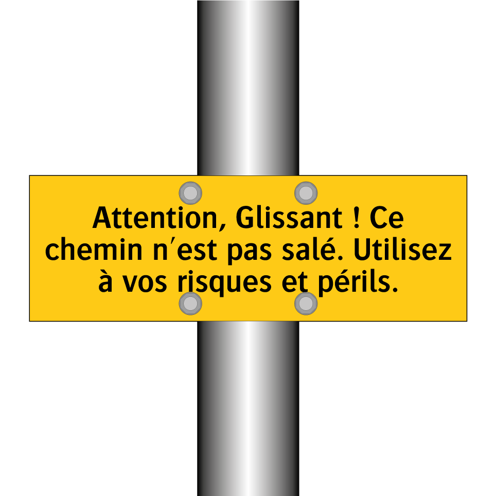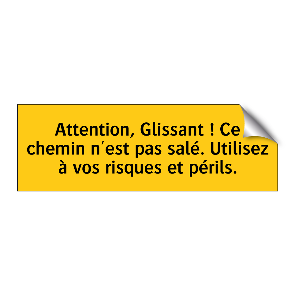 Panneau d'avertissement avec le texte : "Attention, Glissant ! Ce chemin n'est pas salé. Utilisez à vos risques et périls"