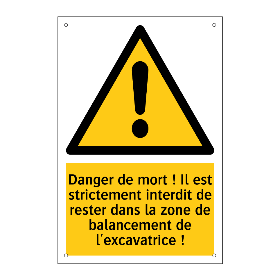 Panneau d'avertissement avec le texte : "Danger de mort ! Il est strictement interdit de rester dans la zone de balancement de l'excavatrice !"