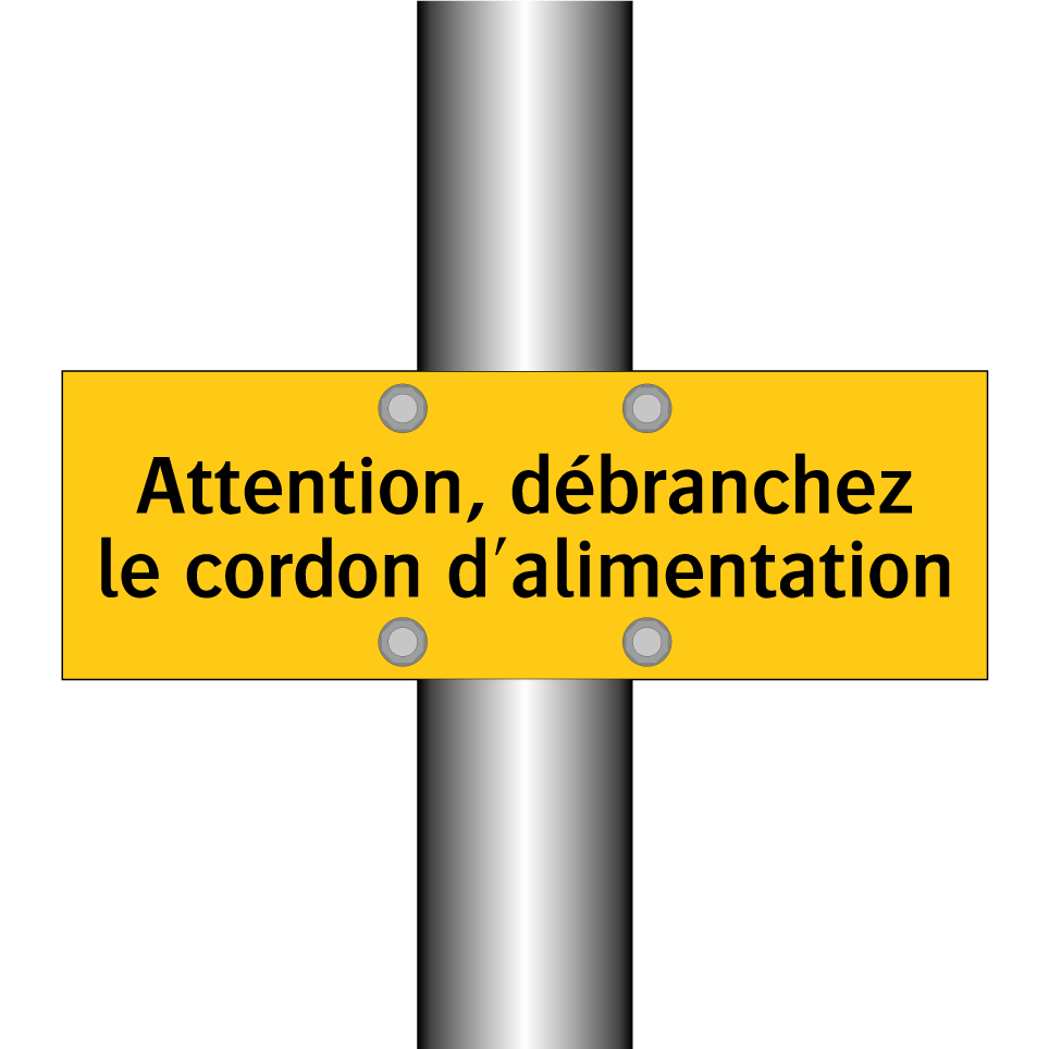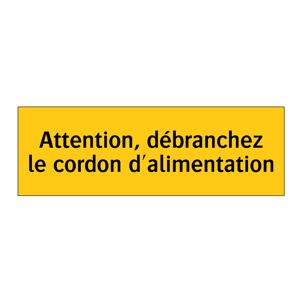 Panneau d'avertissement avec le texte : "Attention, débranchez le cordon d'alimentation"