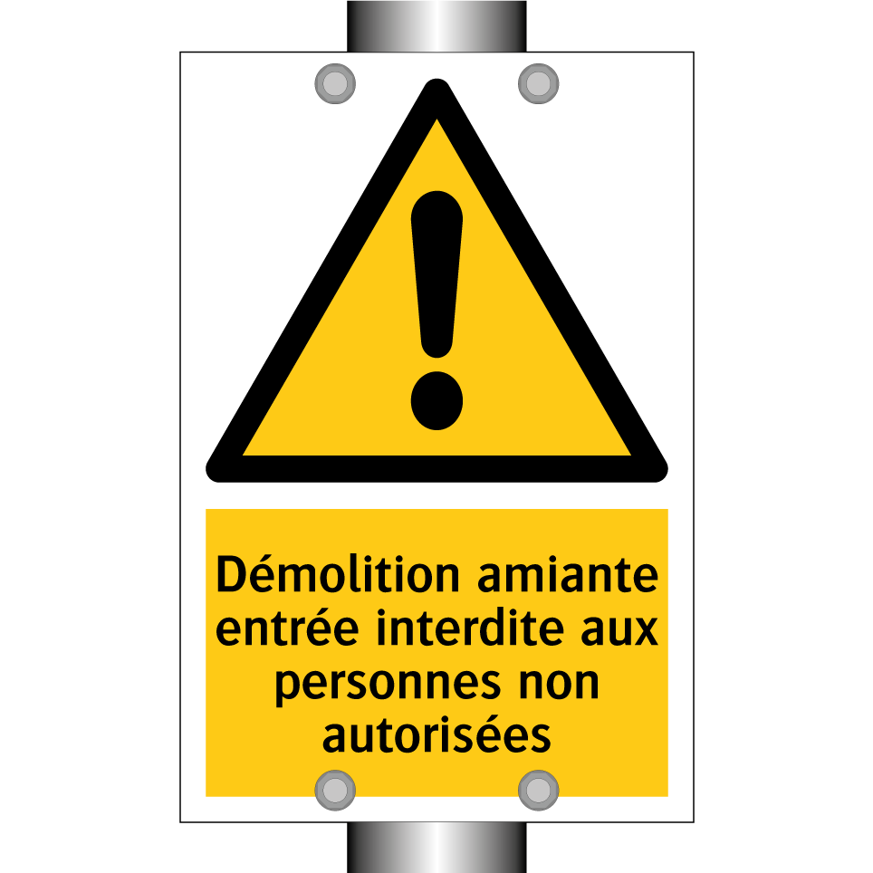 Panneau d'avertissement avec le texte : "Démolition amiante entrée interdite aux personnes non autorisées"