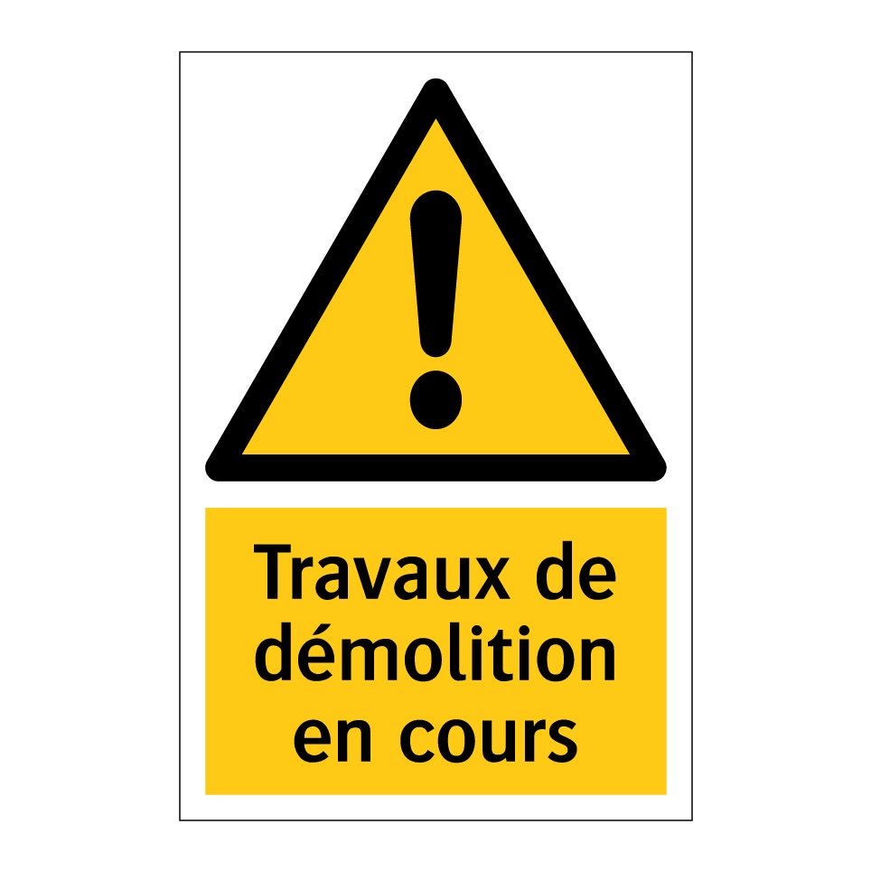Panneau d'avertissement avec le texte : "Travaux de démolition en cours"