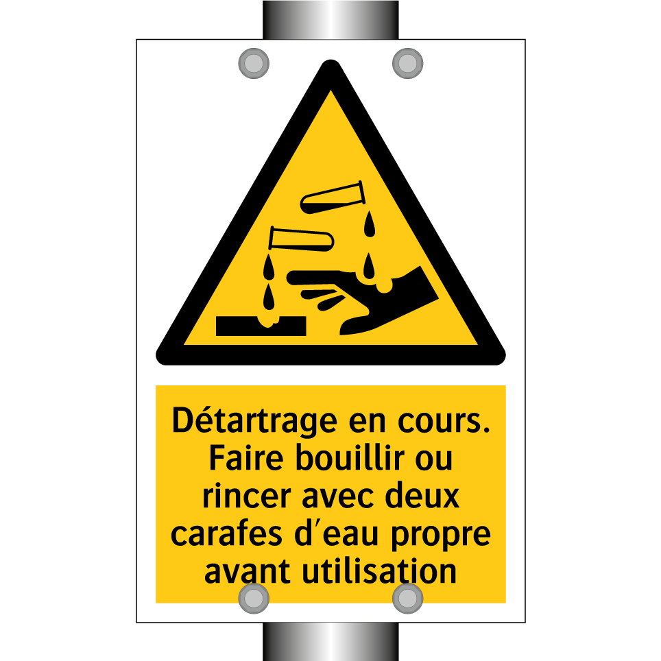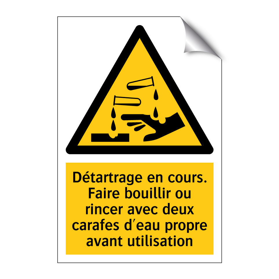 Panneau d'avertissement avec le texte : "Détartrage en cours. Faire bouillir ou rincer avec deux carafes d'eau propre avant utilisation"