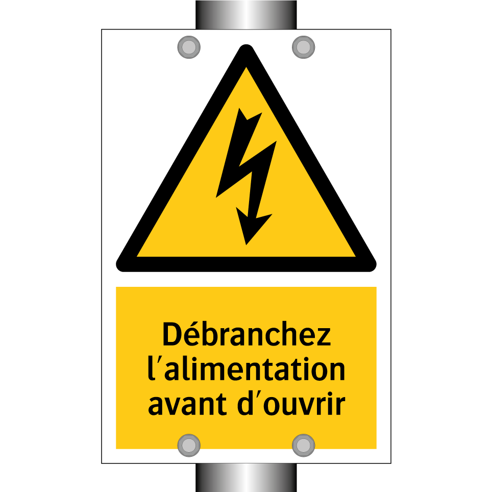 Panneau d'avertissement avec le texte : "Débranchez l'alimentation avant d'ouvrir"