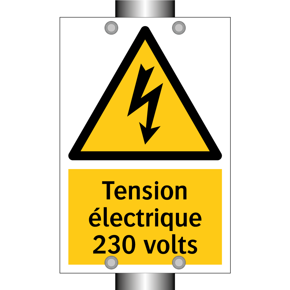 Panneau d'avertissement avec le texte : "Tension électrique 230 volts"