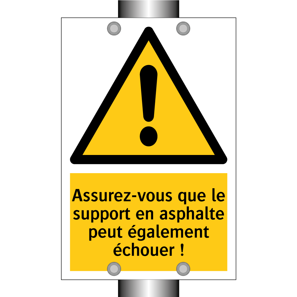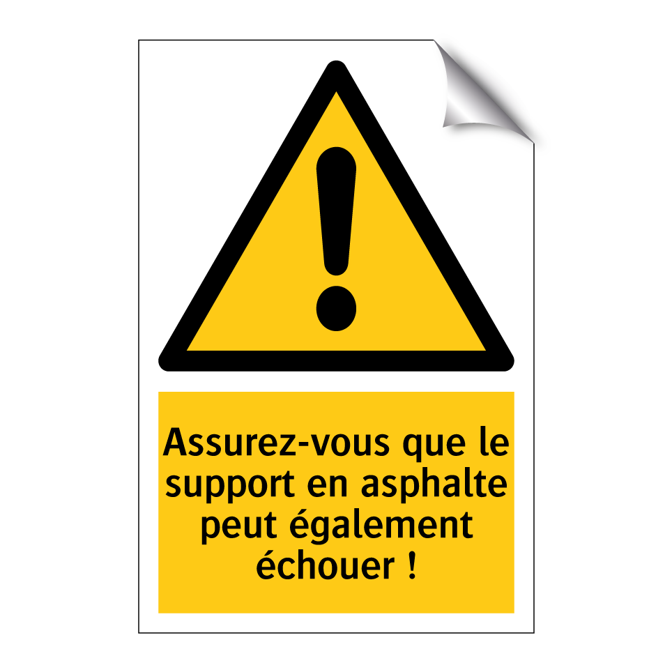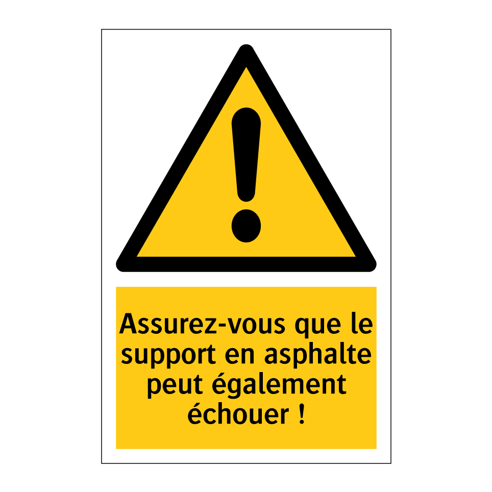 Panneau d'avertissement avec le texte : "Assurez-vous que le support en asphalte peut également échouer !"