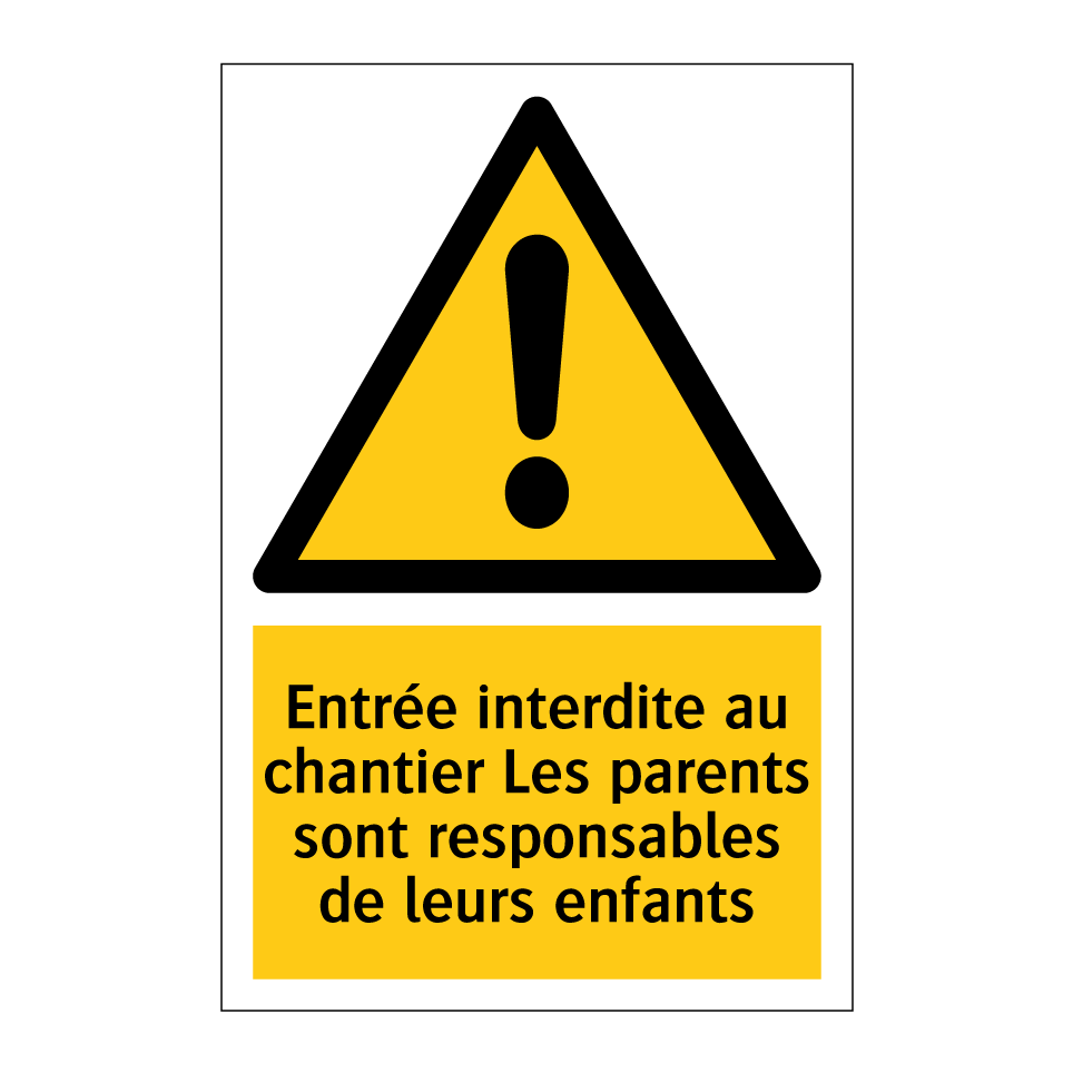 Ce panneau d'avertissement est essentiel pour garantir la sécurité sur les chantiers de construction. Il sert à interdire l'accès aux zones de travail non autorisées, en rappelant aux parents leur responsabilité envers leurs enfants. Ce type de signalisation est idéal pour être placé à l'entrée des chantiers, des zones de construction ou des sites industriels où la sécurité est primordiale. Grâce à sa couleur jaune vive et son texte noir contrastant, il attire immédiatement l'attention, assurant que le message est bien compris. Utilisez ce panneau pour prévenir les accidents et renforcer la sécurité sur votre site.