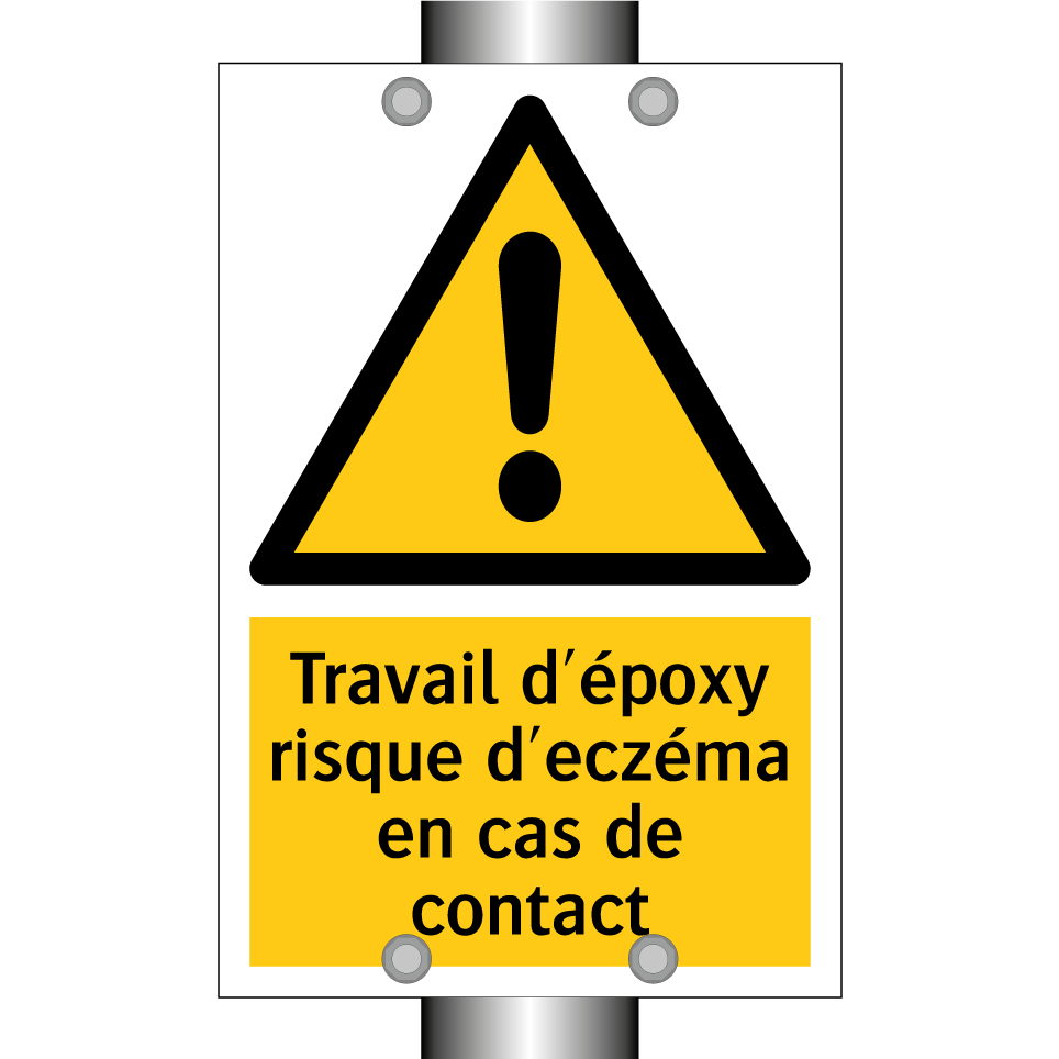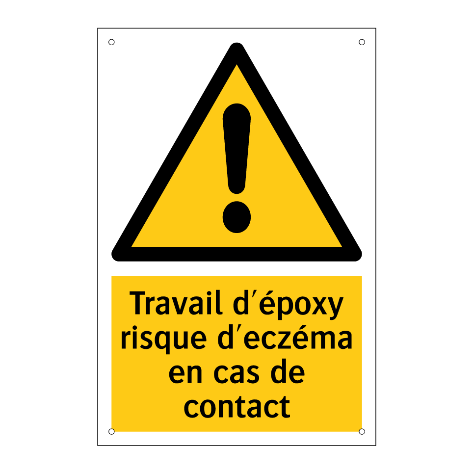 Panneau d'avertissement avec le texte : "Travail d'époxy risque d'eczéma en cas de contact"
