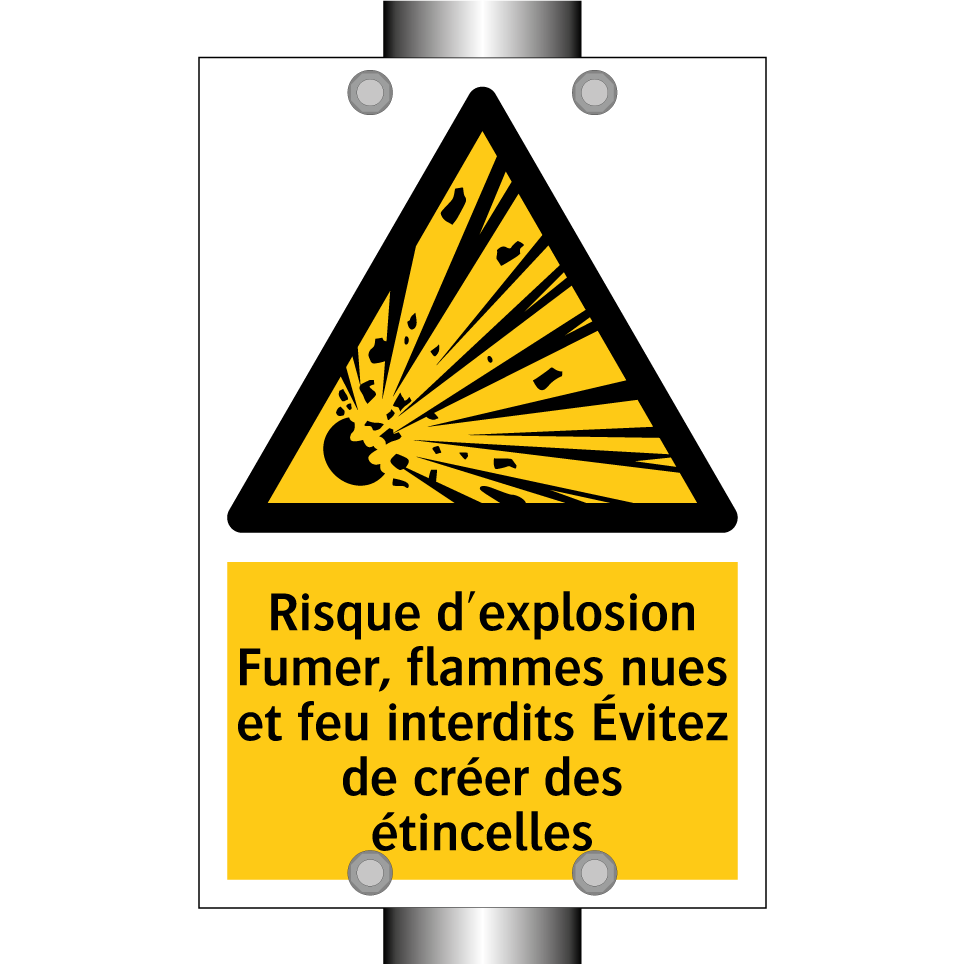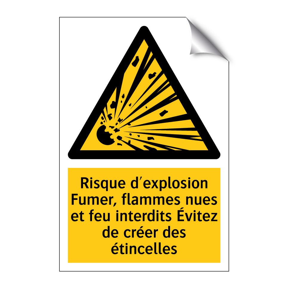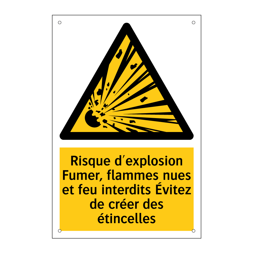 Panneau d'avertissement avec le texte : "Risque d'explosion Fumer, flammes nues et feu interdits Évitez de créer des étincelles"