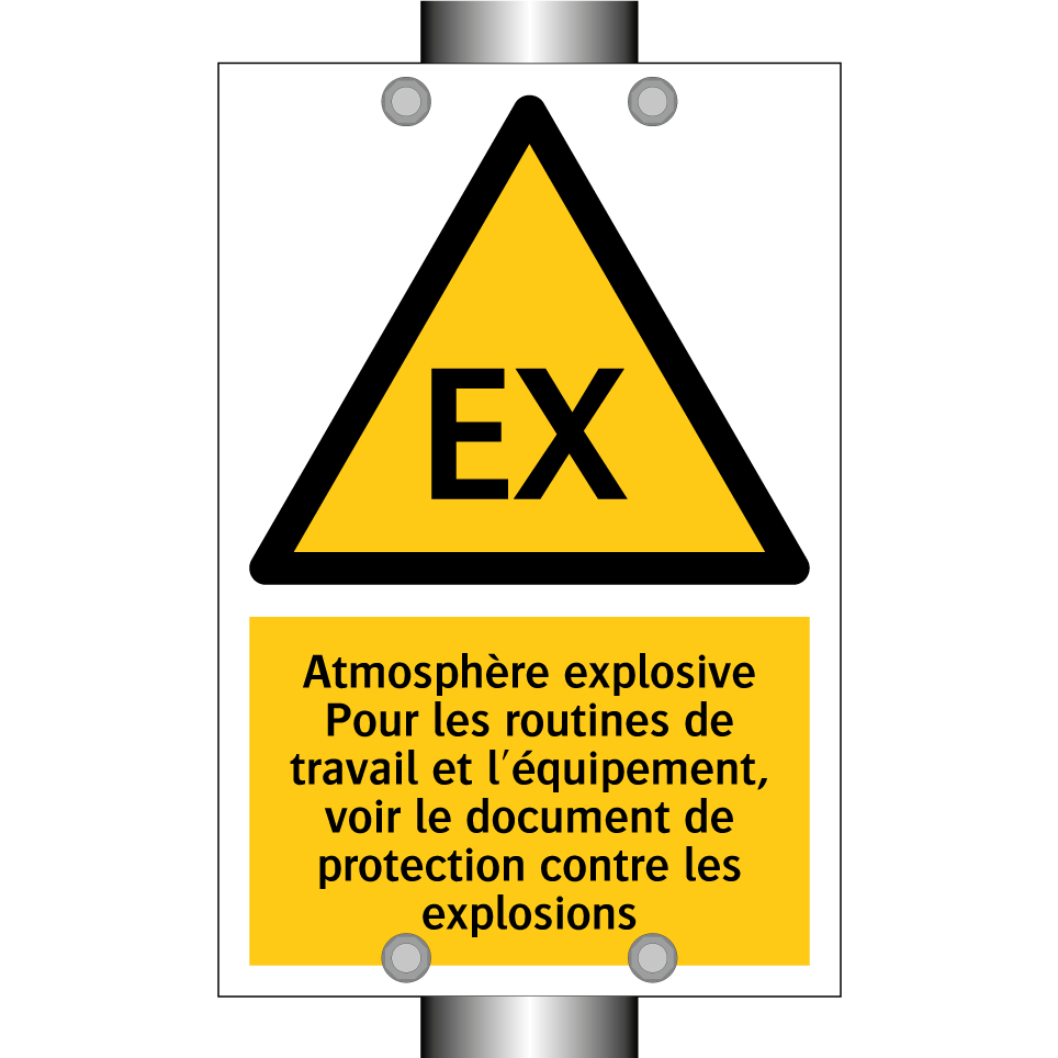 Panneau d'avertissement avec le texte : "Atmosphère explosive Pour les routines de travail et l'équipement, voir le document de protection contre les explosions"