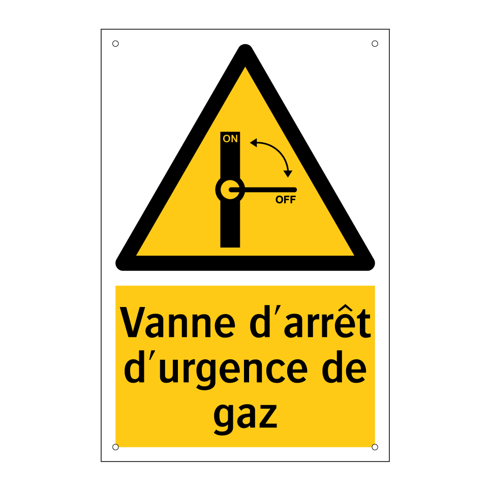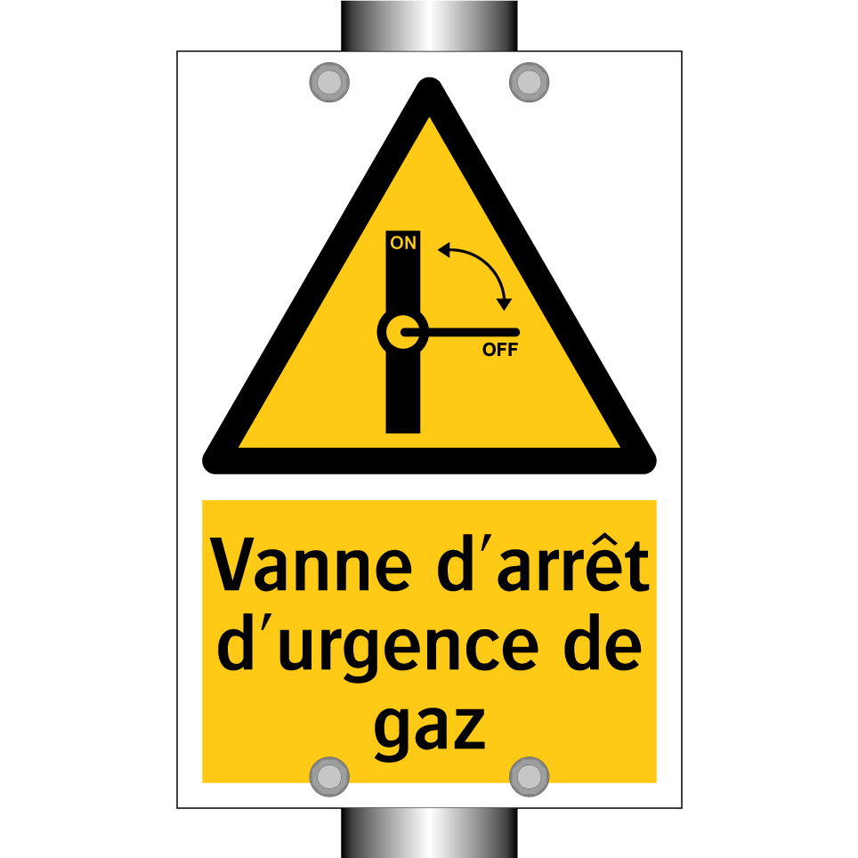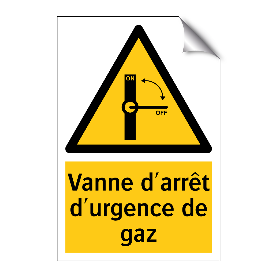 Panneau d'avertissement avec le texte : "Vanne d'arrêt d'urgence de gaz"