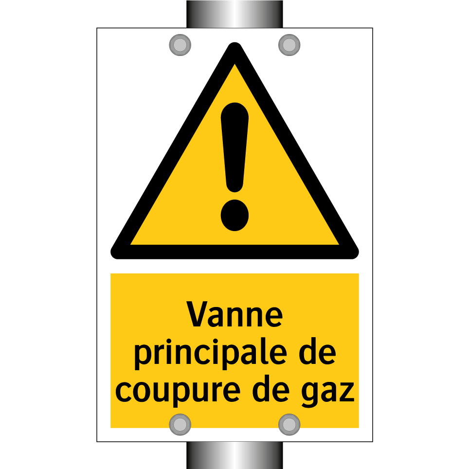 Panneau d'avertissement avec le texte : "Vanne principale de coupure de gaz"