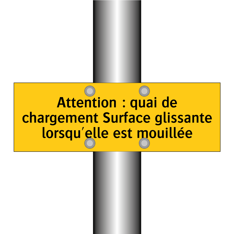 Panneau d'avertissement avec le texte : "Attention : quai de chargement Surface glissante lorsqu'elle est mouillée"