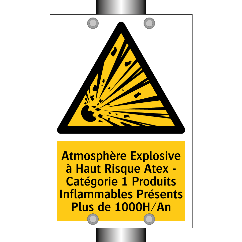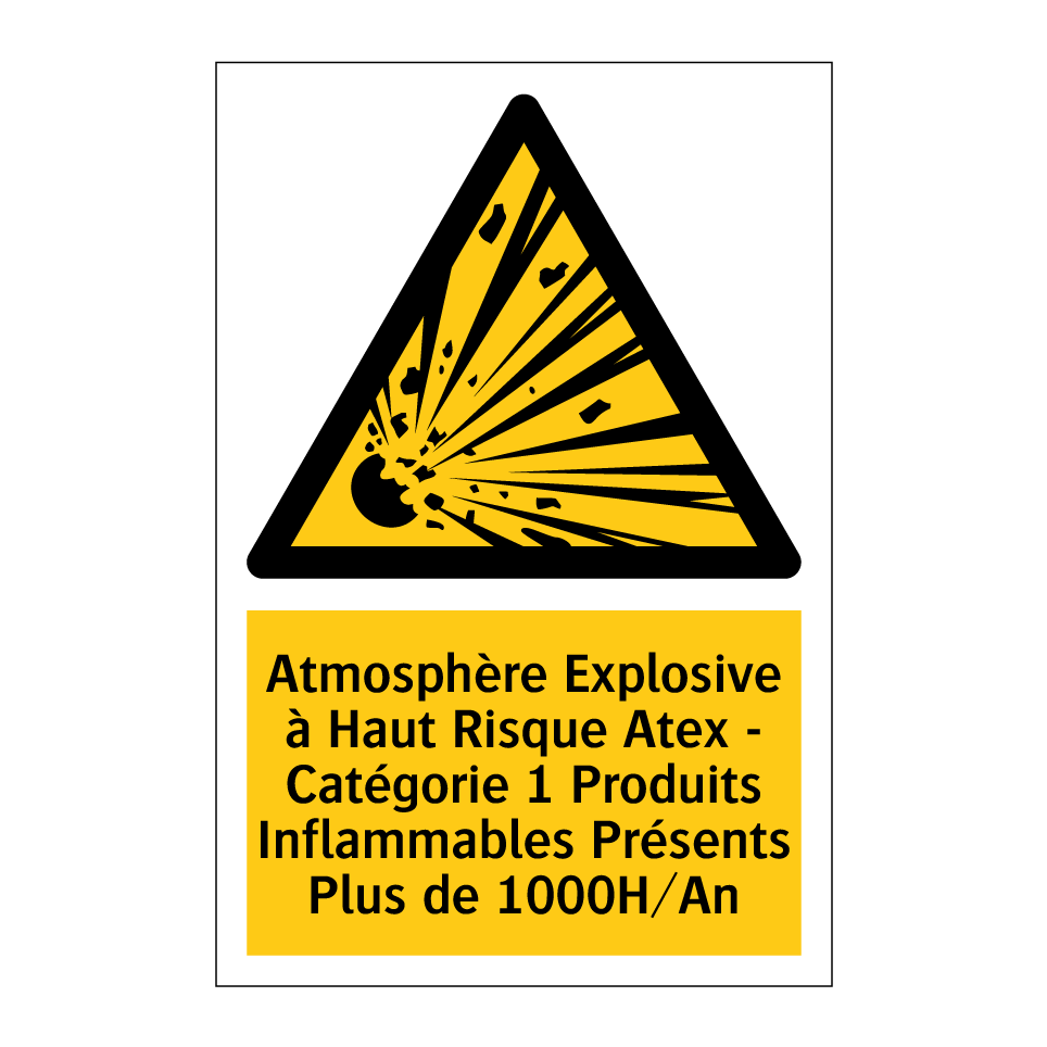 Panneau d'avertissement avec le texte : "Atmosphère Explosive à Haut Risque Atex - Catégorie 1 Produits Inflammables Présents Plus de 1000H/An"